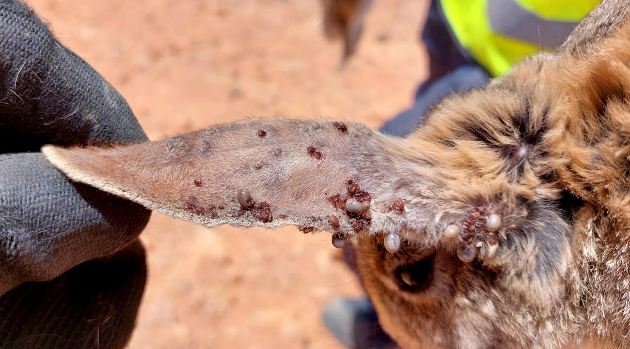 Lo que se ve en la imagen es la parte externa de una de las orejas de un conejo. No vemos la parte interna donde también se enganchan las garrapatas. Y tampoco vemos la otra oreja. Las garrapatas buscan un buen lugar donde asirse para chupar la sangre. No son mosquitos que se posan sobre nuestra piel y en poco tiempo chupan nuestra sangre. Necesitan su tiempo, tener seguridad y encontrar una zona idónea. En el conejo las orejas son ideales porque, aunque el conejo se rasque, no se las puede quitar. Tampoco la garrapata lo pone fácil al clavar fuertemente su probóscide.