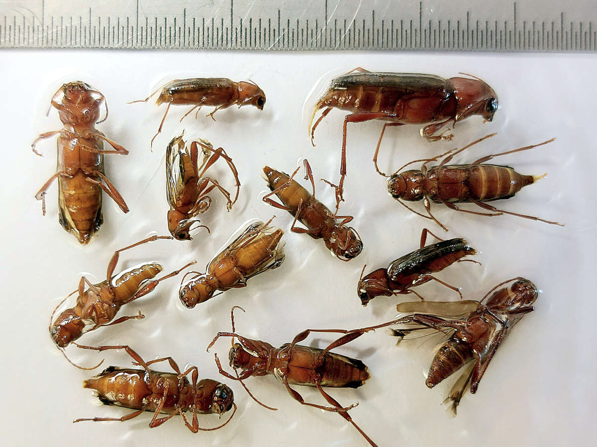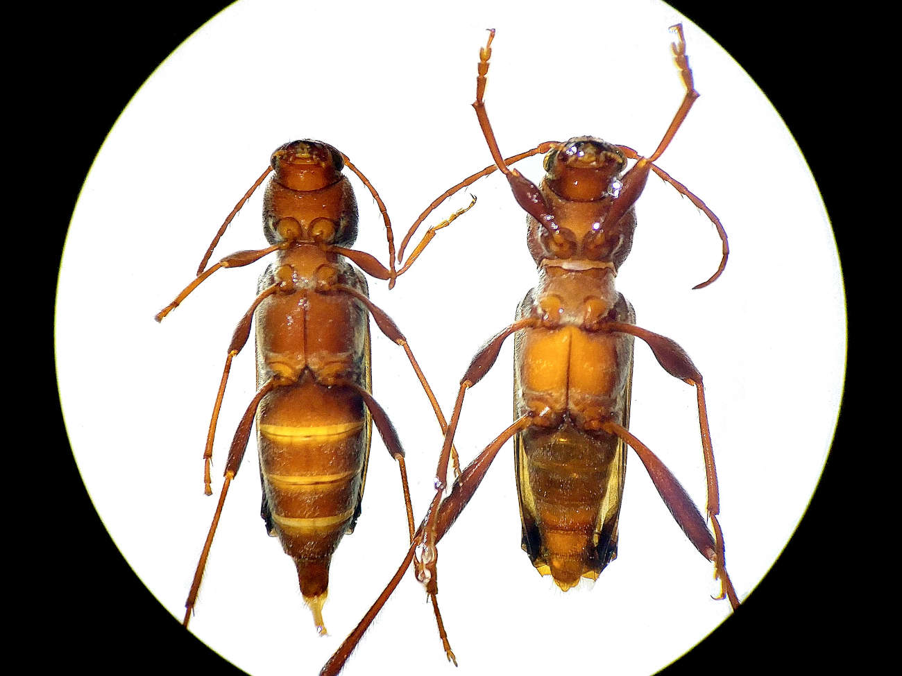 En la imagen número 5, se pueden ver los 12 ejemplares que recolectó y que me hizo llegar. Los conservamos en alcohol para que con el envío no se estropearan. La muestra tenía 4 machos y 8 hembras. Y en las imágenes 6 y 7 se puede ver una hembra y un macho en vista dorsal y ventral. Se diferencian bien por longitud de antenas (más largas en el macho), tamaño y coloración del pronoto (más corto y oscuro en la hembra) y longitud de élitros (en la hembra son más cortos y dejan al descubierto el extremo del abdomen).