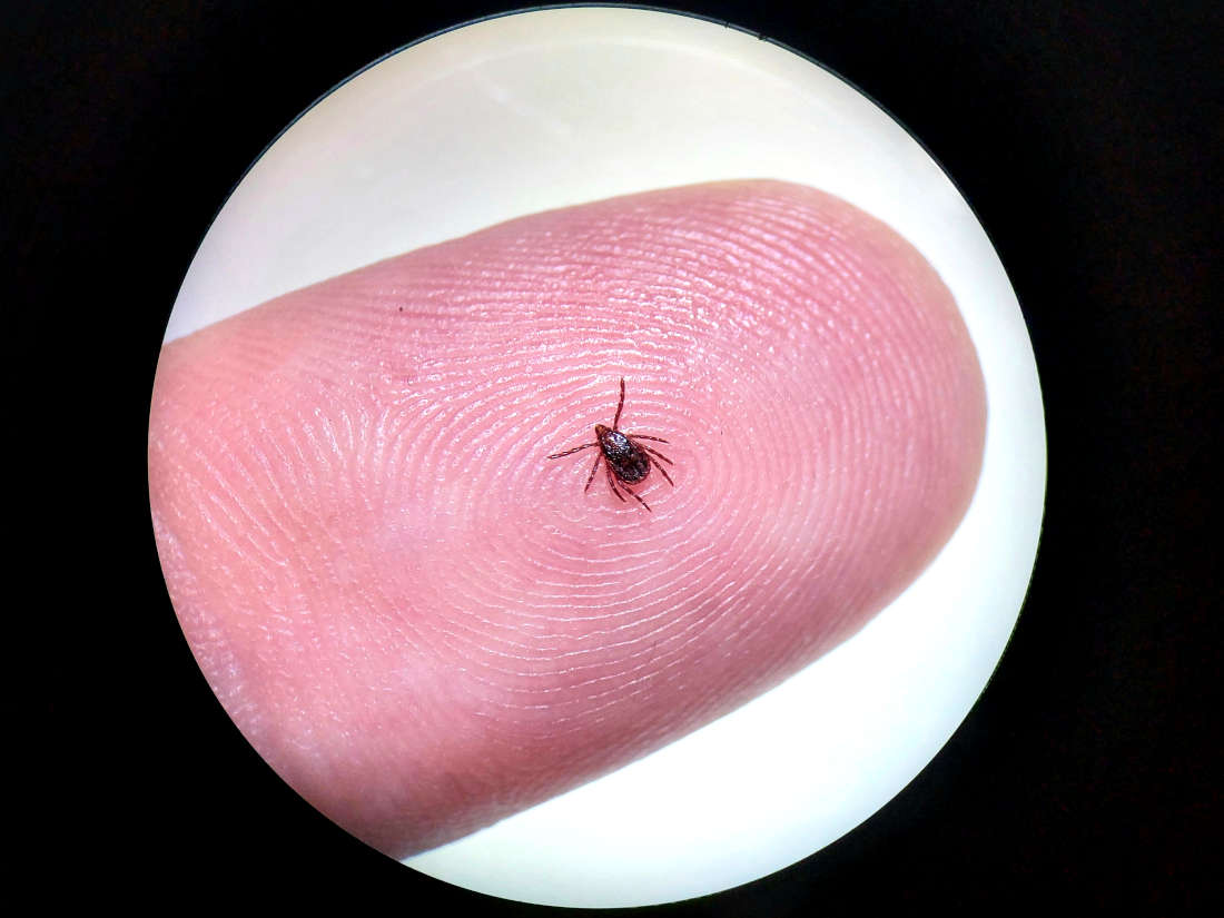 En zonas donde hay una gran presencia de conejo (Oryctolagus cuniculus) no solo encuentro un gran número de la garrapata Hyalomma lusitanicum, sino también de Rhipicephalus pusillus [1]. Sin embargo, esta segunda es más difícil de ver, porque mientras la primera tiene una longitud de unos 5 mm aproximadamente, la segunda mide poco más de 2 mm. Puede parecer que no hay mucha diferencia, pero cuando hablamos del mundo micro, 3 mm de diferencia es mucho. En la imagen número 1, se pueden ver una hembra de cada especie puesta frente a frente sobre una regla milimetrada. La hembra de R. pusillus es muy pequeña y si se sube encima nuestro no la vamos a ver. Por suerte, no somos el hospedador que necesita. En las imágenes 2 y 3 se puede ver otra hembra sobre mi dedo.
