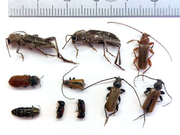 Sin embargo, aproveché para ver si podía hacerme llegar una muestra de los coleópteros que habían aparecido. Ella recogió los que salieron entre los días 10 y 12 de junio y me los hizo llegar. Me quedé gratamente sorprendido por la variedad de xilófagos de cinco especies pertenecientes a las familias Cerambycidae, Bostrichidae y Buprestidae (figura 1). Solicité a Judit Fernández si me podía decir de que especie vegetal era la leña y su origen. Ella tuvo la amabilidad de hablar con quien le proporcionó la leña. Le dijo que el origen era en el Vallès Oriental y la madera era de encina (Quercus ilex) y olivo (Olea europaea). Esta es la relación de xilófagos de la muestra: