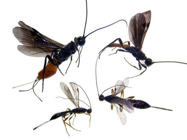 Y para finalizar, queda por mencionar a los parasitoides. Por supuesto, tanto xilófago no podían aparecer solos. Junto a ellos están los himenópteros que completan su ciclo sobre las larvas. En la imagen número 6, se puede ver una hembra y un macho de una misma especie de Ichneumonidae. No sé qué especie es porque esta familia no es fácil. A veces, te encuentras con alguna especie característica y fácil de identificar. Como se puede ver, la hembra dispone de un largo oviscapto que introduce en grietas para colocar un huevo en la larva. También hay parasitoides de la familia Brachonidae. En la imagen número 7 se pueden ver ejemplares pertenecientes a dos especies diferentes. No quiero imaginar la larva de xilófago que está protegida y comiendo tranquilamente en la madera. De repente siente una punzada y le meten un huevo en el cuerpo. Ahí empezó el fin de su vida.