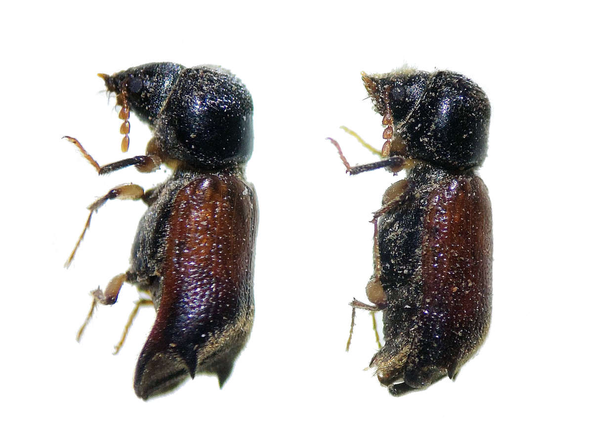 Respecto a los bostríquidos, mencionar que ambas especies no son raras, especialmente la primera que se encuentra por toda la península Ibérica [3]. Los adultos de Bostrichus capucinus miden entre 5 y 16 mm de longitud y aparecen entre abril y septiembre. Su aspecto con los élitros rojos es característico (figura 4). Según Pablo Bahillo de la Puebla et al. [3], colonizan maderas muertas de especies de robles (Quercus) principalmente, pero también de haya, castaño, ciruelo, olivo, etc. En cuanto a Xylopertha praetusa, apuntar que era lo que más abundaba con más de 100 ejemplares. Algunos estaban destrozados, por lo que paré de contar al pasar de la centena. Siguiendo con la fuente bibliográfica de Pablo Bahillo de la Puebla et al. [3], los adultos tienen una longitud de 4 a 8 mm. Como se puede ver en la imagen número 5, hay un claro dimorfismo entre el macho y la hembra en la forma de la parte posterior de los élitros. Se encuentran por toda la península Ibérica. Las larvas se alimentan de madera muerta de diferentes especies vegetales de Quercus, aunque pueden también vivir en madera de higuera y otras frondosas.