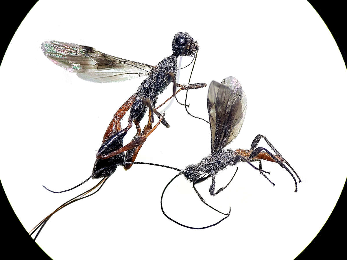 Y para finalizar, queda por mencionar a los parasitoides. Por supuesto, tanto xilófago no podían aparecer solos. Junto a ellos están los himenópteros que completan su ciclo sobre las larvas. En la imagen número 6, se puede ver una hembra y un macho de una misma especie de Ichneumonidae. No sé qué especie es porque esta familia no es fácil. A veces, te encuentras con alguna especie característica y fácil de identificar. Como se puede ver, la hembra dispone de un largo oviscapto que introduce en grietas para colocar un huevo en la larva. También hay parasitoides de la familia Brachonidae. En la imagen número 7 se pueden ver ejemplares pertenecientes a dos especies diferentes. No quiero imaginar la larva de xilófago que está protegida y comiendo tranquilamente en la madera. De repente siente una punzada y le meten un huevo en el cuerpo. Ahí empezó el fin de su vida.