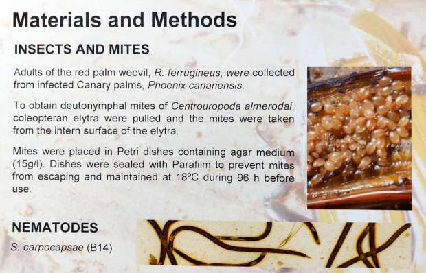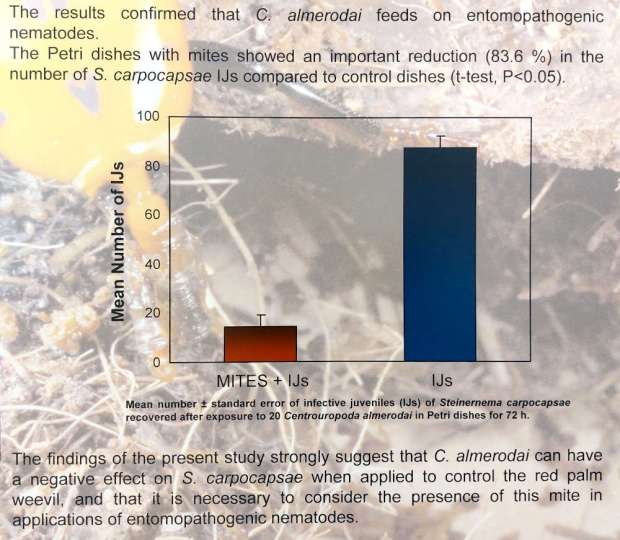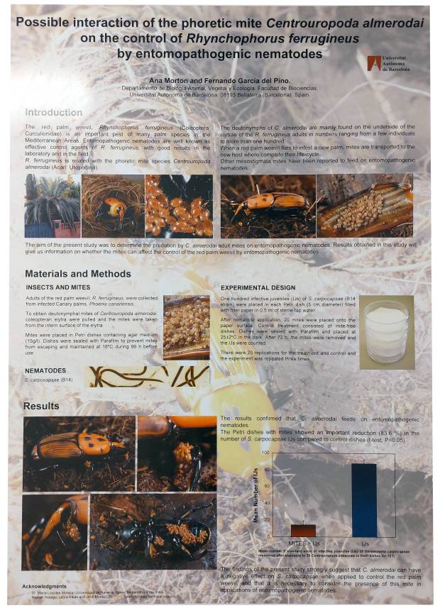 Como se puede leer en el póster, los autores recolectaron ácaros alojados en el interior de los élitros. Pusieron los ácaros usieron en placas bien acondicionadas junto a nematodos de la especie Steinernema carpocapsae, la cual es justo utilizada para control del picudo. En cada placa pusieron 100 nematodos y 20 ácaros. El resultado después de muchas réplicas fue que los ácaros se alimentan de los nematodos. Los autores indican la importancia de sus resultados para el tratamiento biológico de las larvas del picudo con los nematodos. Además, mostraría una relación de beneficio mutuo. Los picudos transportan a los ácaros y estos protegerían a los picudos.