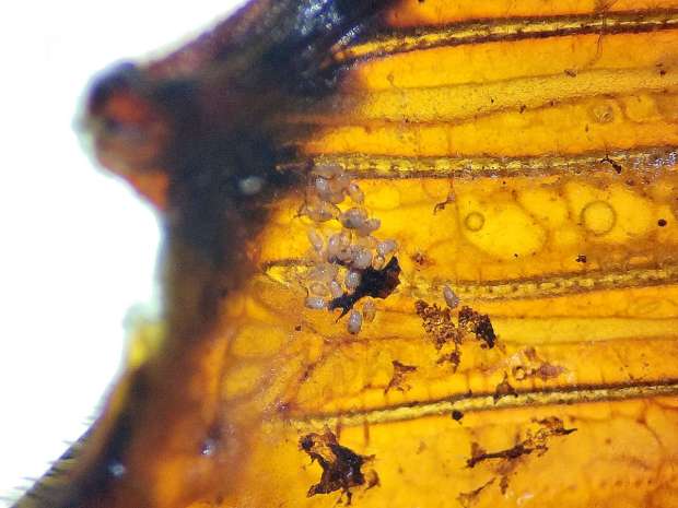 Fig 2. Ácaros foréticos en lase de los élitros de un picudo rojo de las palmeras./ C. Pradera 06-2024
