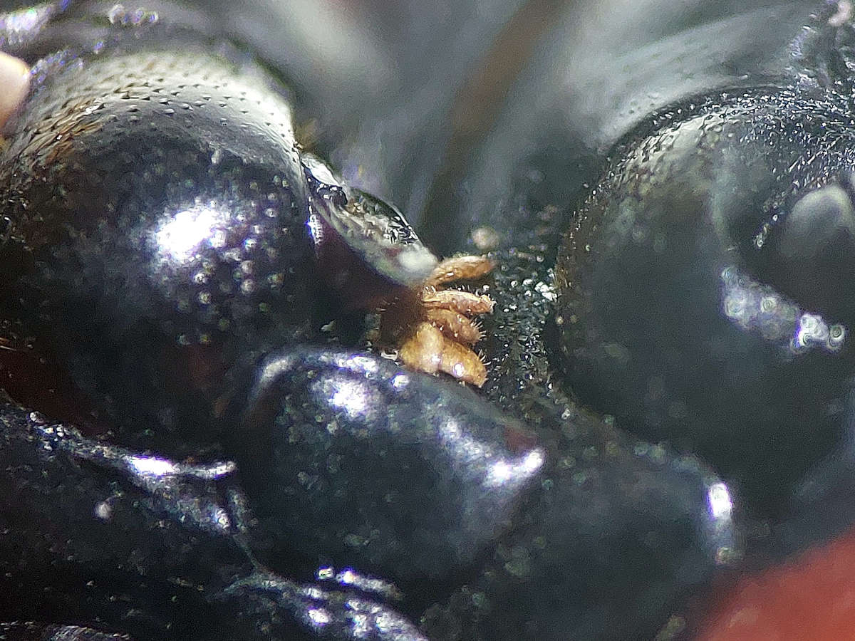Fig 3. Ácaros foréticos en lase de los élitros de un picudo rojo de las palmeras./ C. Pradera 06-2024