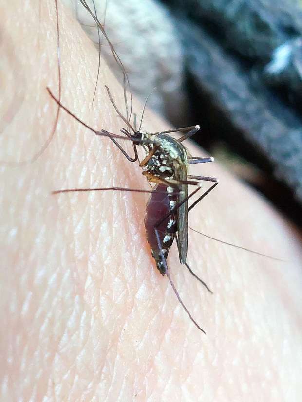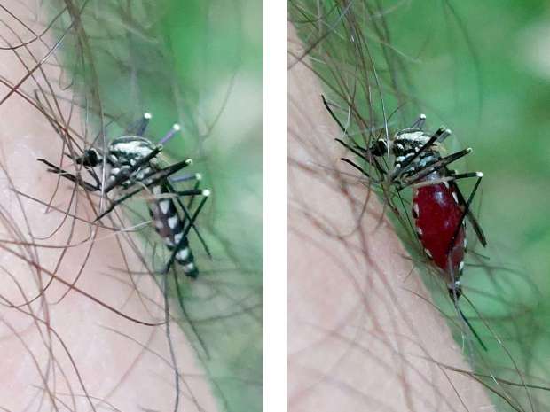 Pues bien, el pasado sábado estaba sentado junto a la tienda de campaña cuando llegaron algunas hembras ansiosas. He de decir que geniculatus es una especie menos cuidadosa que Aedes albopictus que va con mucha cautela. Lo cierto es que permití que me chuparan la sangre solo por el placer de observar. En total, fueron tres hembras que se aprovecharon de mi buen estado de ánimo. En la imagen número 1, se puede ver una primera hembra donde se observa el antes y el después del proceso de ingesta de sangre. En las imágenes 2 y 3, se puede ver una segunda hembra. Y en el vídeo 1, se ve el tiempo que tarda una hembra en llenar su abdomen. Al tiempo del vídeo, hay que añadir unos 10 segundos desde que aterrizó y acercó su trompa. Por tanto, esta especie en menos de 2 minutos ya tiene proteína para madurar los óvulos.