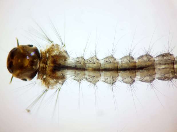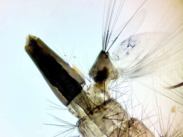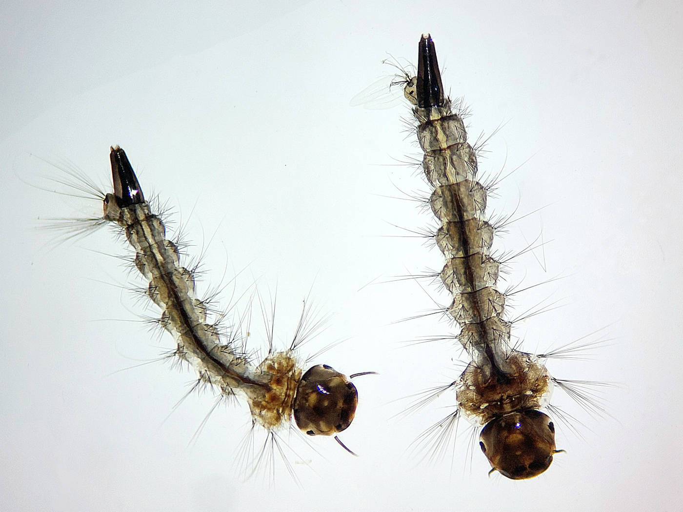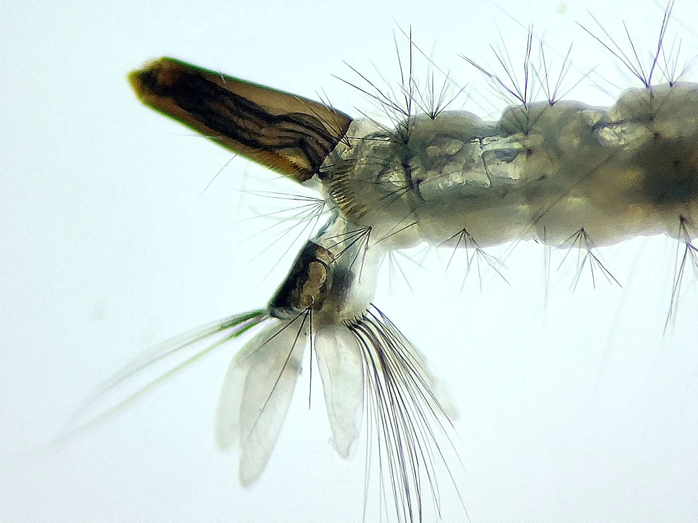 Sin embargo, en el cubo de la fregona además de larvas del Culex, encotré también otras que al principio pensé que podían ser de Culiseta longiareolata, especie común en acumulaciones artificiales que tienen agua todo el año. Según mis conocimientos, Culex pipiens y Culiseta longiareolata son las especies con mayor distribución en la península Ibérica. Ahora bien, luego vi que podrían ser de Aedes. Al llegar a casa, con ayuda de la lupa binocular me di cuenta de que eran de genicualatus. En las imágenes 8 a 12 se pueden ver dos larvas y detalles de esta. Esta es la primera vez que encuentro esta especie fuera de un hueco en un árbol. Esto da cuenta de su capacidad de adaptación a lo que encuentre.