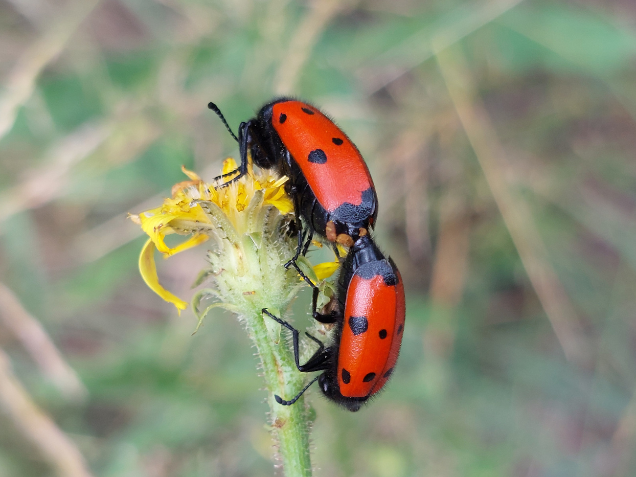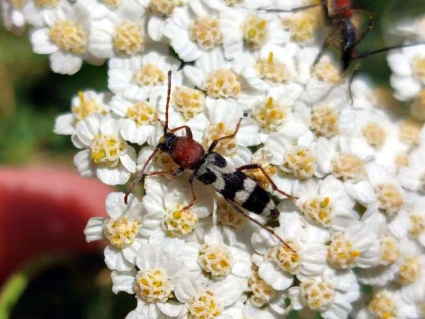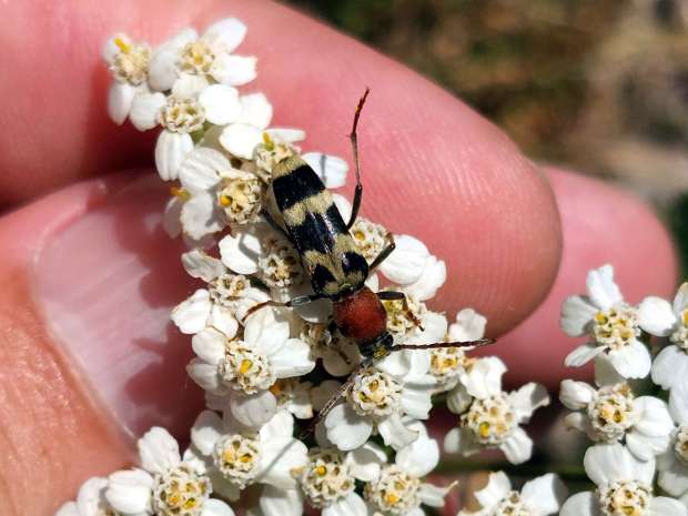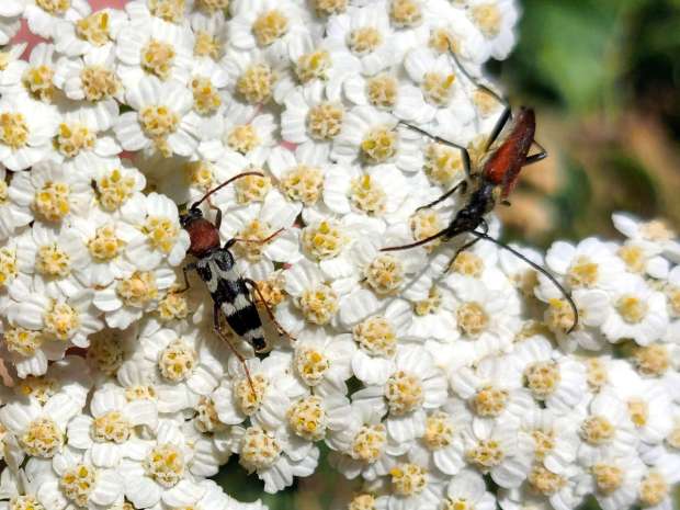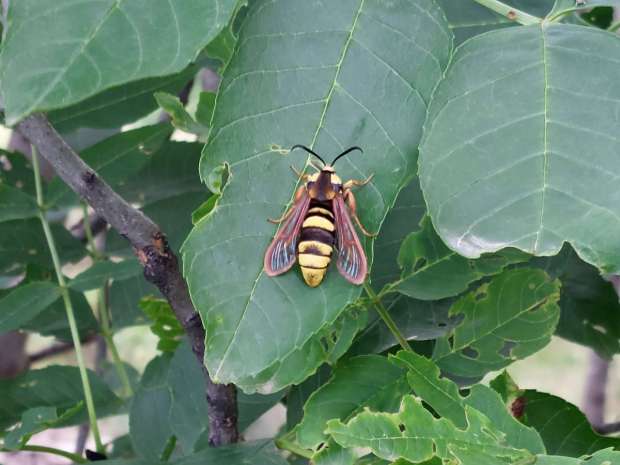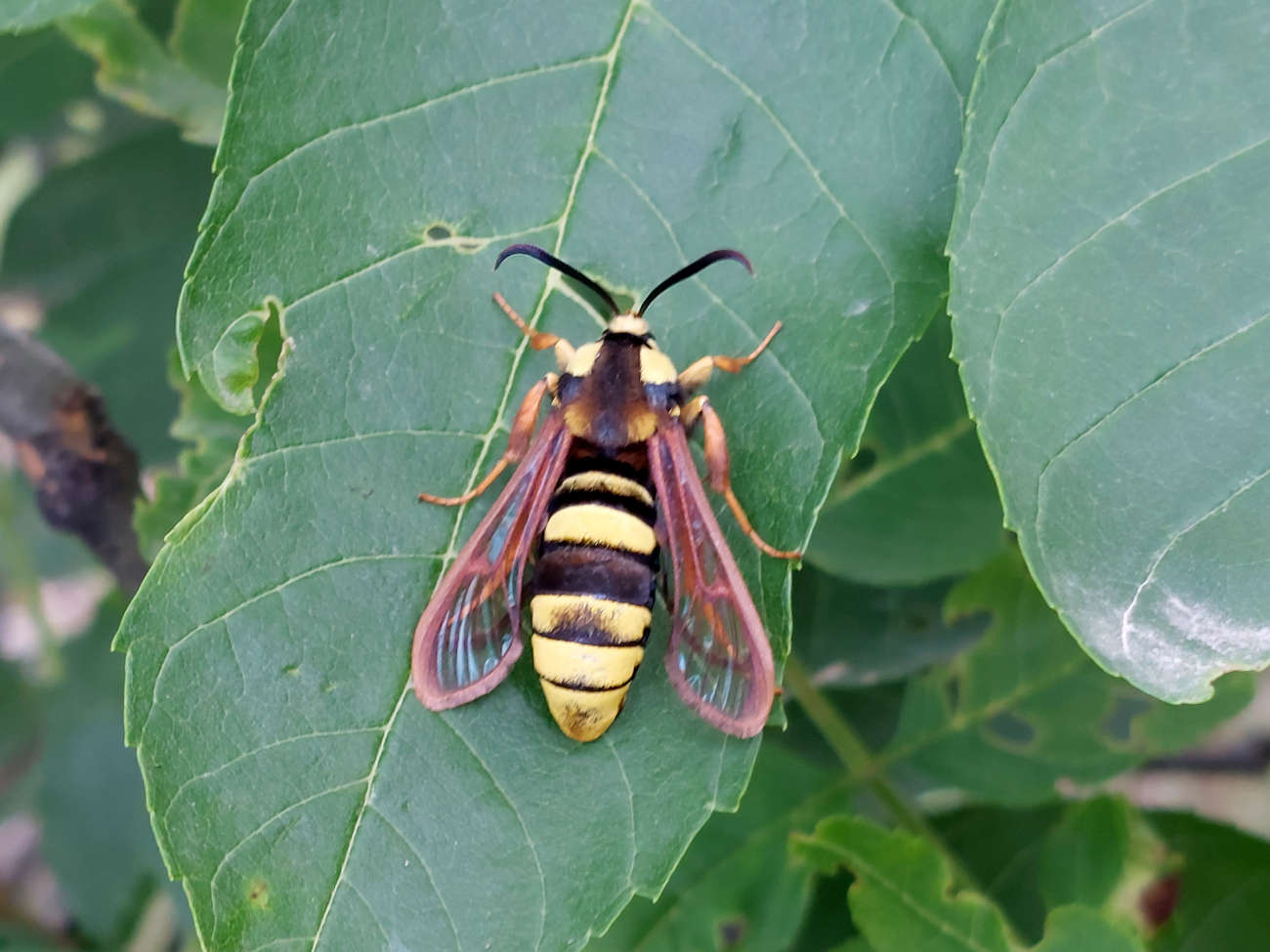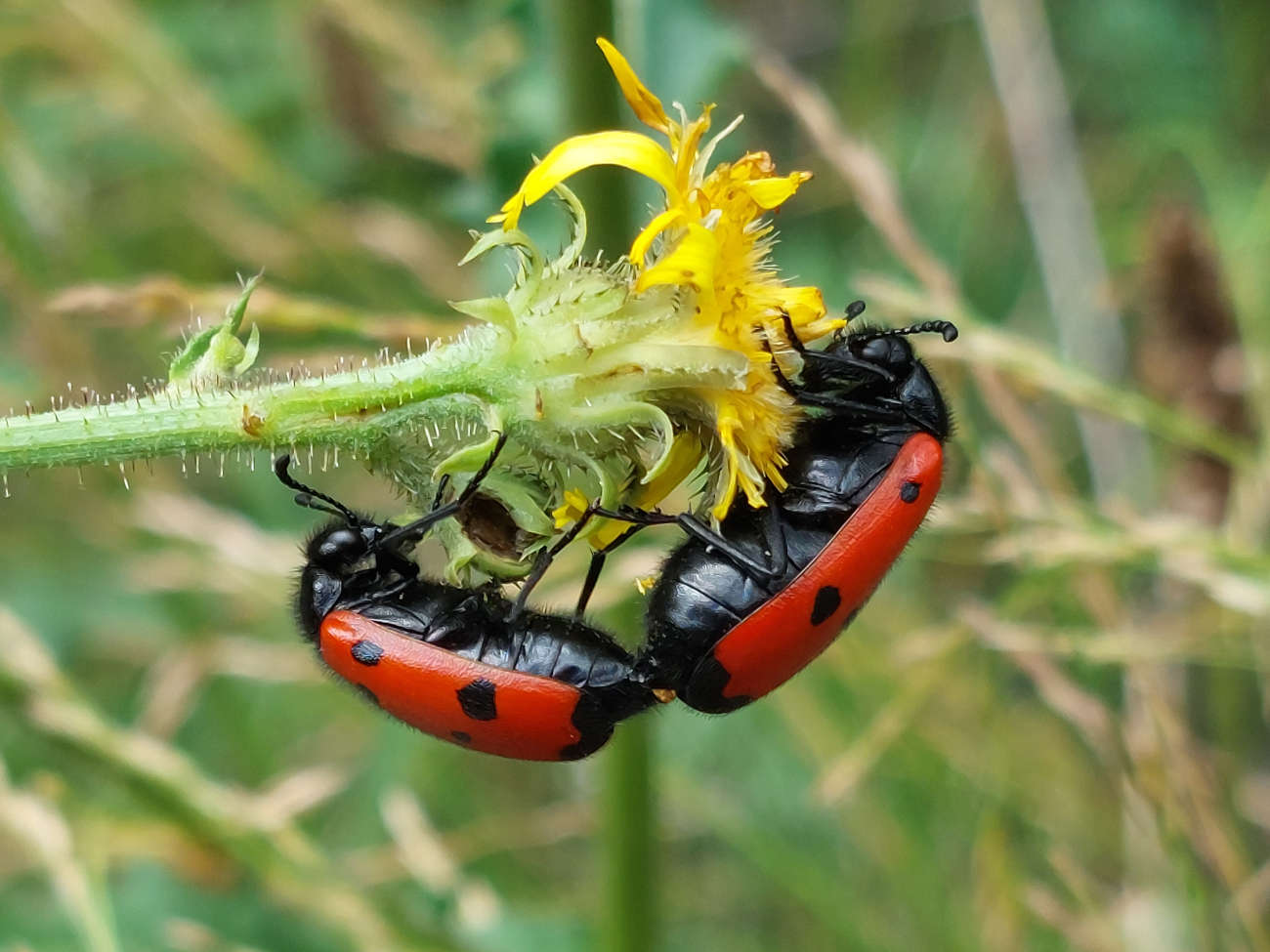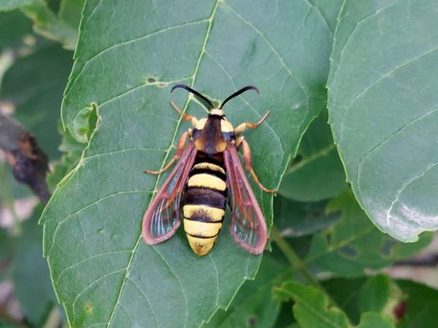 También encontré otros interesantes insectos. De hecho, en verano en el Pirineo lo que no faltan son insectos. Destaco una pareja de Mylabris quadripunctata (Meloidae), especie que no es rara de ver (figuras 11-12). Después de la cópula, la hembra de este género pone los huevos en el suelo donde la larva depreda puestas y larvas de otros insectos que completan su ciclo en el suelo. En el caso de Mylabris variabilis, la hembra pone los huevos cerca de una puesta de saltamontes de cuyos huevos se alimenta la larva [4]. Y también encontré un ejemplar de Sesia apiformis, mariposa conocida como perforadora de los chopos (figuras 13-14). Para mí es poco común. La hembra hace la puesta sobre la corteza de árboles caducifolios, principalmente Populus. La larva se introduce en el tronco donde completa su crecimiento. Cumple un ciclo por año apareciendo los adultos en primavera-verano. Es una mariposa grande de unos 5 cm que no solo sorprende por su aspecto mimético con abejas y avispas, sino también por su vuelo sonoro. Te das cuenta de su presencia cuando pasa volando cerca.
