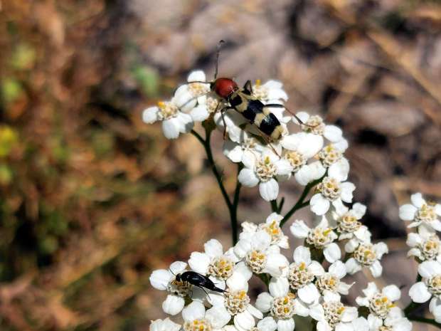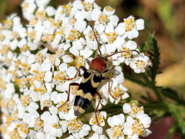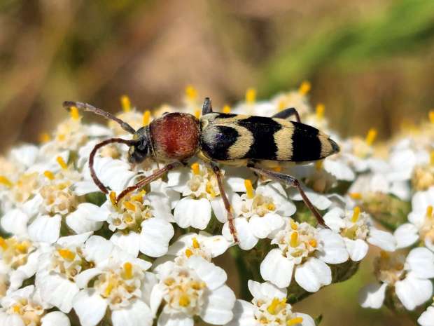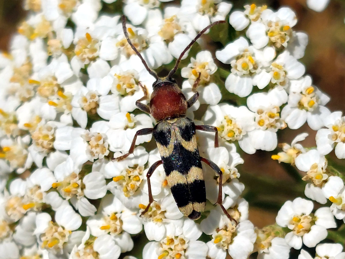 La larva de Clorophorus trifasciatus se desarrolla sobre ramas muertas de árboles del género Quercus principalmente, pero también sobre otras muchas plantas [2]. Tiene un ciclo anual y los adultos aparecen de abril a septiembre donde se los puede ver sobre flores de umbelíferas [3]. No se asustan cuando uno se acerca para tomar unas fotografías. De hecho, la belleza de este coleóptero queda realzada sobre el fondo blanco de las flores.