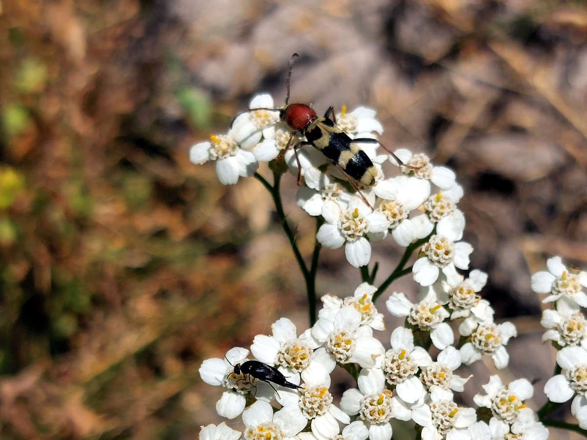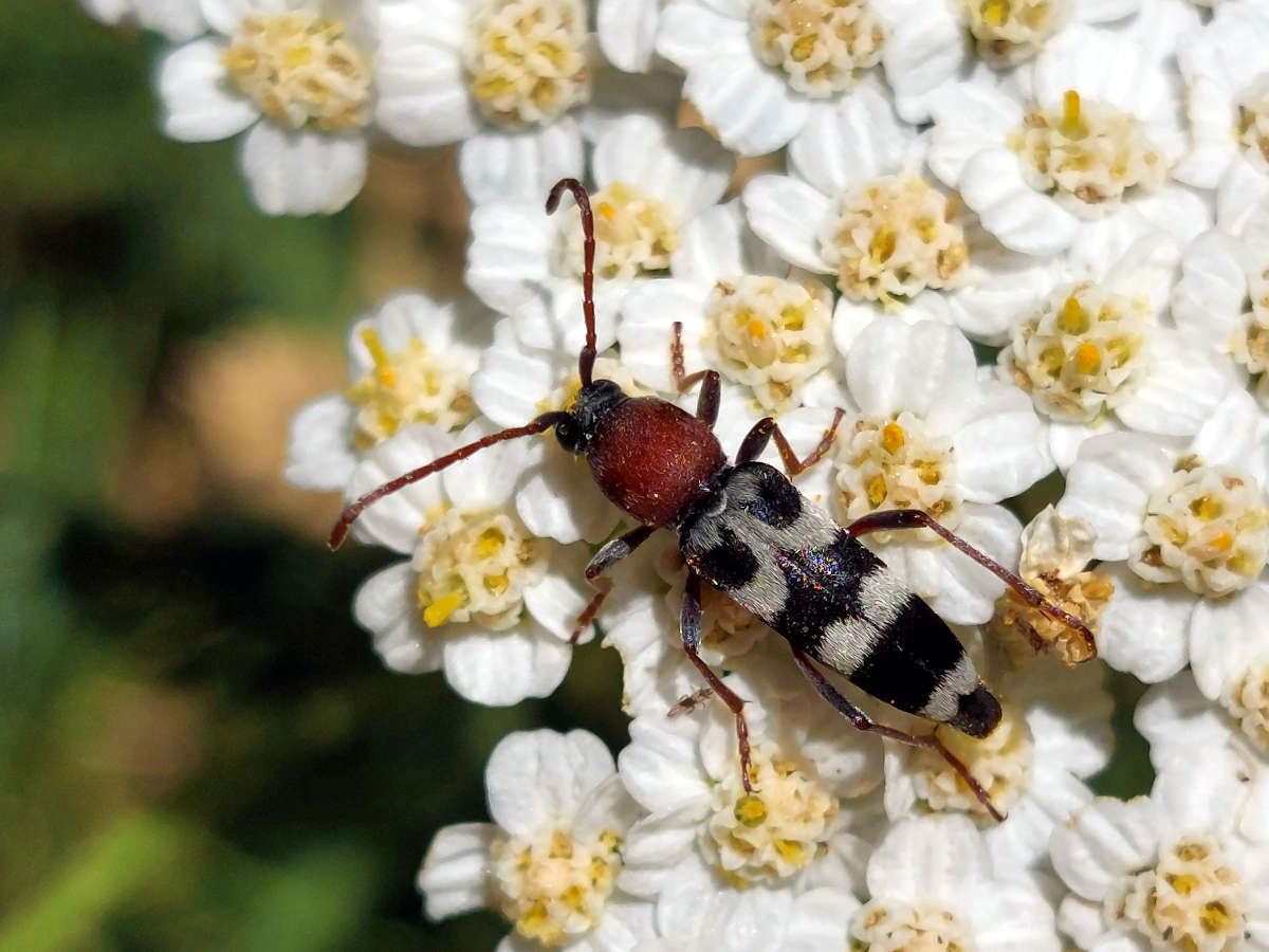 Sobre las flores había coleópteros entre los que destacaban los longicornios (Cerambycidae). Por su belleza, me fijé en los Clorophorus trifasciatus (figuras 3-10). Intentando sacar el máximo beneficio a la cámara del teléfono móvil, aproveché para tomar fotografías. Esta especie se encontraba sobre flores blancas como se puede apreciar. Es una especie común en la zona donde vivo. Según Eduard Vives, es abundante en toda la península Ibérica y tiene una distribución por Europa Meridional y África del Norte [2]. Se encuentra desde el nivel del mar hasta alta montaña [3]. Es de tamaño medio de unos 10 mm de longitud. Su porte, como se aprecia en las fotos, es característico. Se puede confundir con Chlorophorus hungaricus, especie muy parecida, pero que se encuentra en Europa oriental [3].