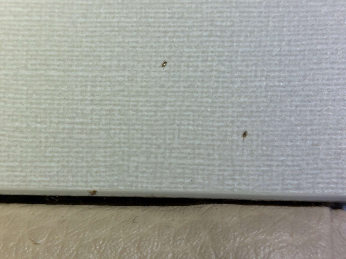 El tema es que me llegó el caso. Y viendo que habían habido picaduras, decidí ir a ver la habitación de hotel. En la imagen número 1, se puede ver cómo había quedado después de hacer mi compañero la inspección. Al acercarme al cabecero de la cama, observé unos pocos ácaros (figuras 2 y 3). La persona responsable de mantenimiento venía conmigo. Me explicó que él también los había visto. En una habitación de hotel, si uno ve ácaros con este aspecto, solo puede pensar en ácaros de las aves. El principal sospechoso es Dermanyssus gallianae que es un hematófago de aves [1]. Es común en aves de corral, pero está por todas partes.