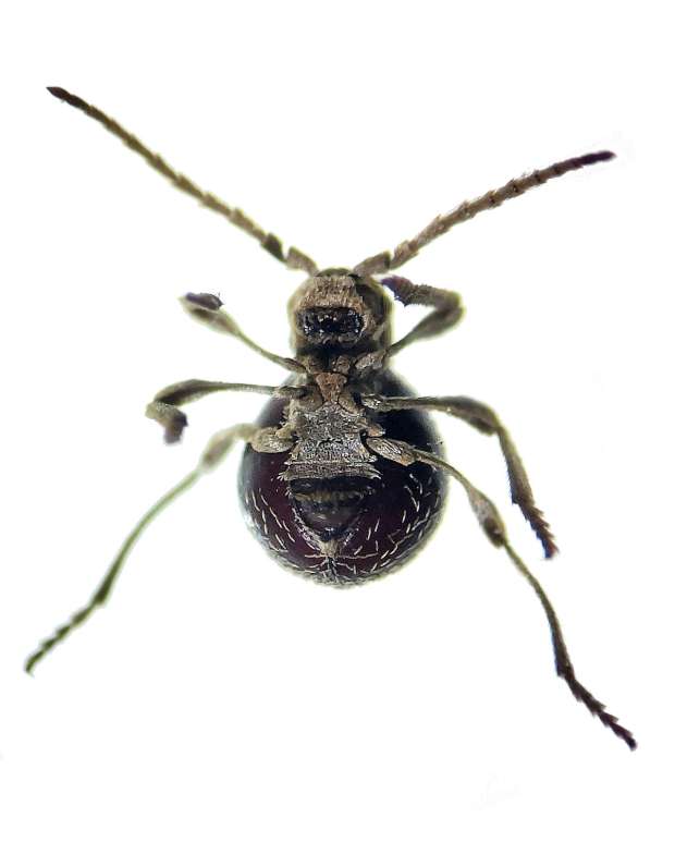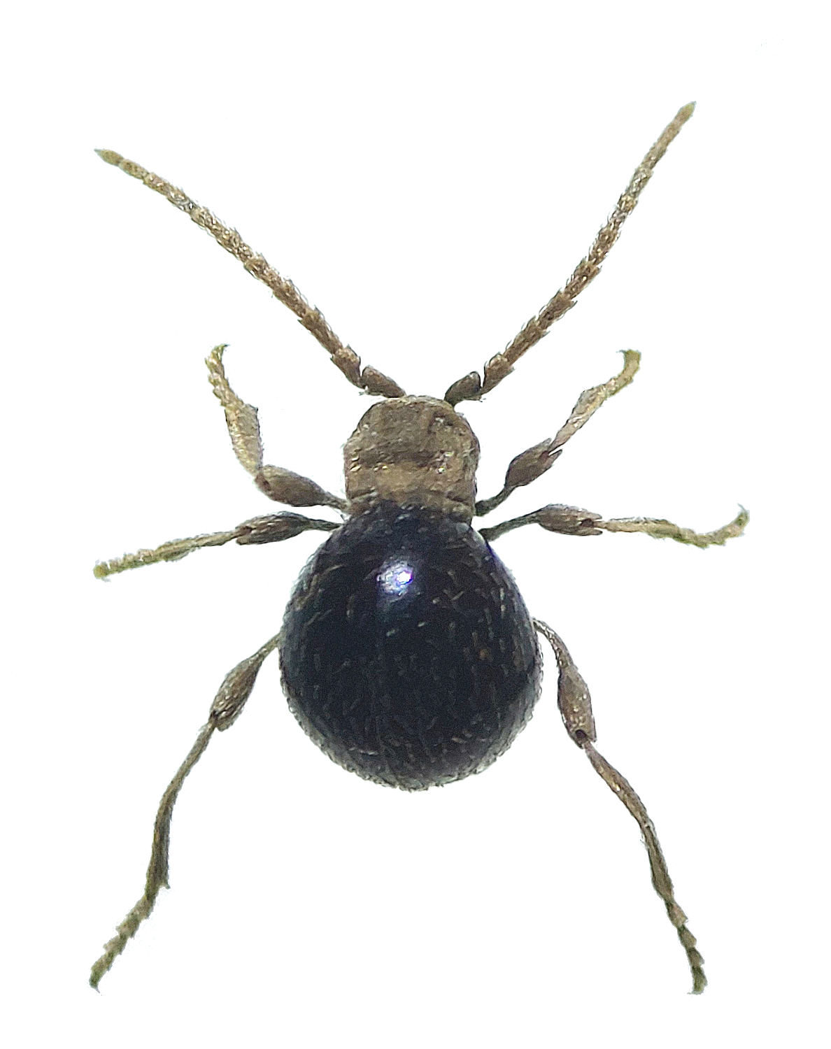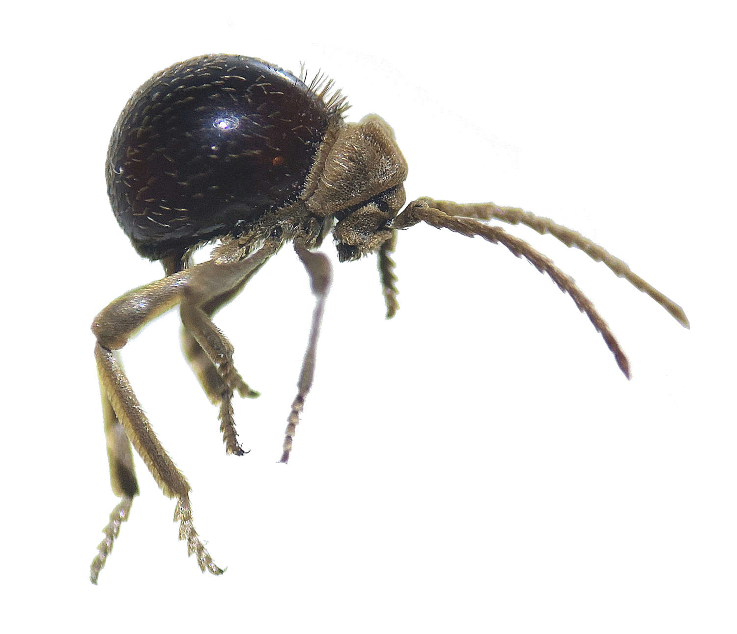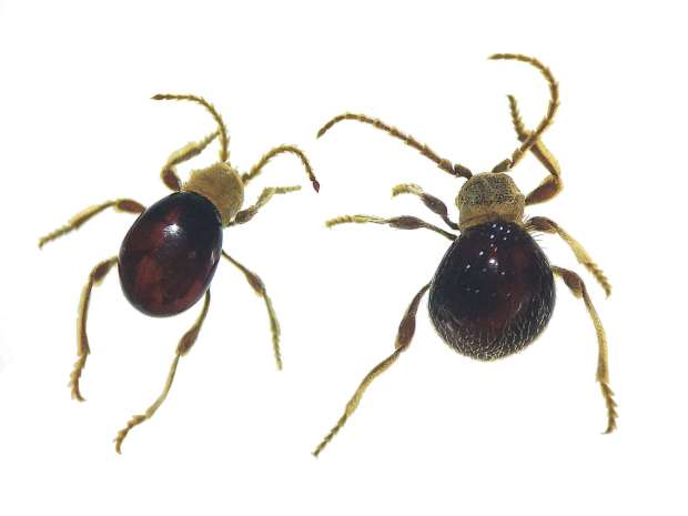 Cuando me acerqué, vi que se trataba de un escarabajo araña, es decir, de una especie de la subfamilia Ptininae. Son interesantes y tienen un andar que despista. Tienen una longitud del cuerpo de 2-3 mm. Las largas antenas parecen dos patas delanteras que mueve tal cual. Me han llegado numerosas consultas al correo con fotografías dando por sentado de que se trataba de ácaros. En estos 20 años que llevo en control de plagas, los he visto poco. Por supuesto, antes de que este escarabajo acabara en un frasco de muestras, recibió mi atenta mirada.