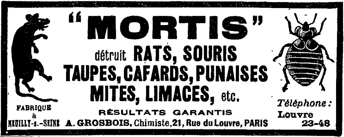 Los productos Mortis fueron comercializados a partir de la década de 1910, pero desconozco hasta cuándo. No he encontrado información sobre el fabricante. En la publicidad antigua aparece el nombre del químico A. Grosbois con sede en la Rue du Louvre, 21, de París y con fábrica en Neuilly-sur-Seine (figuras 2-4). En otros anuncios que parecen posteriores, hay otra dirección en la Rue du Fauconnier, 11, de París (figuras 4-9). Y también aparece otra dirección en otros anuncios en la Avenue Gabriel-Péri, 13, de Montreuil-sous-Bois (figuras 1, 10-11).