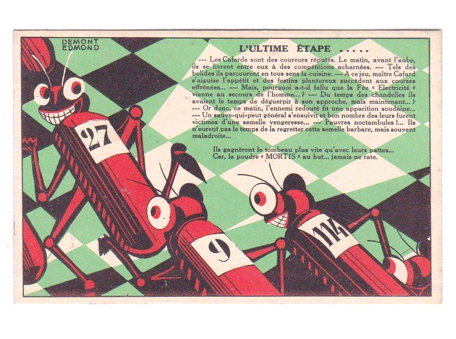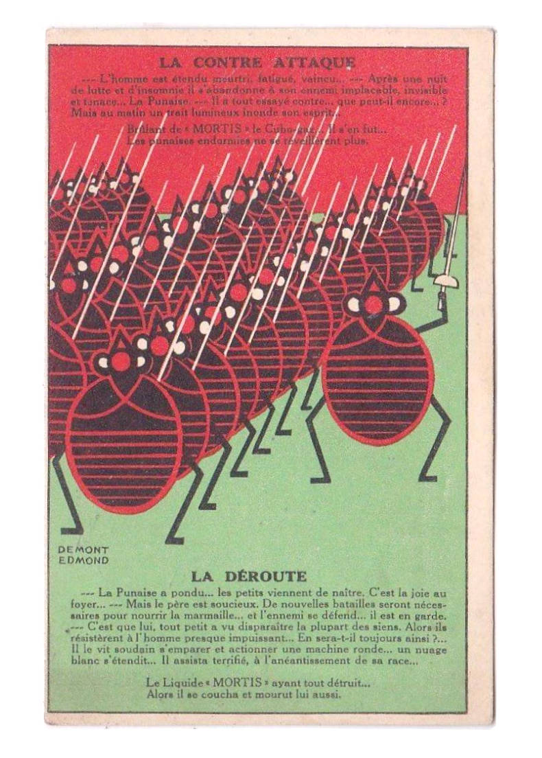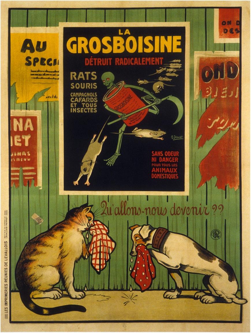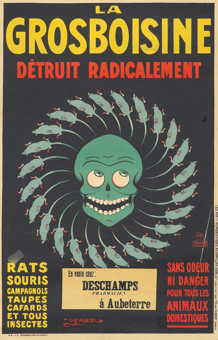 Como se puede ver, la publicidad era muy imaginativa y apelaba, de la misma manera que la marca comercial, a la destrucción total de todo tipo de alimañas (vermine) como ratas, ratones, topillos, topos, cucarachas, pulgas, hormigas, polillas, etc. Los productos fueron formulados en pasta para desratización y polvos y líquidos para desinsectación. Otra marca de plaguicidas de uso doméstico de A. Grosbois fue La Grosboisine (figuras 25-26).