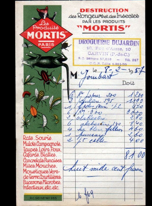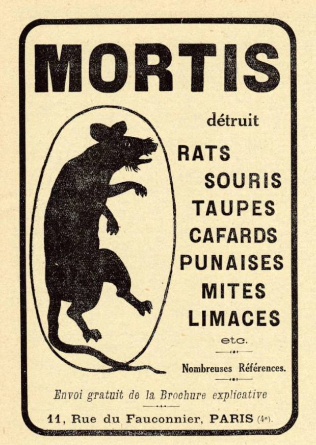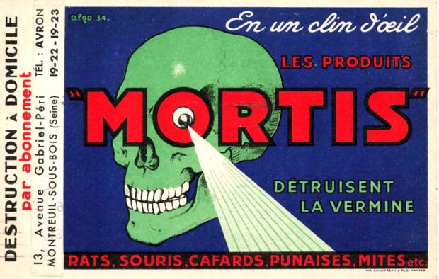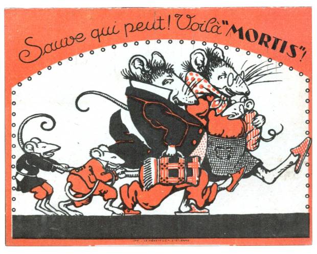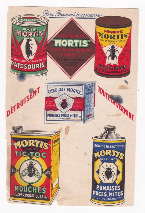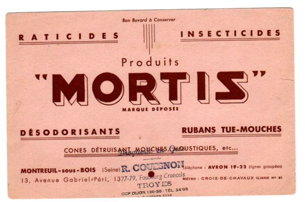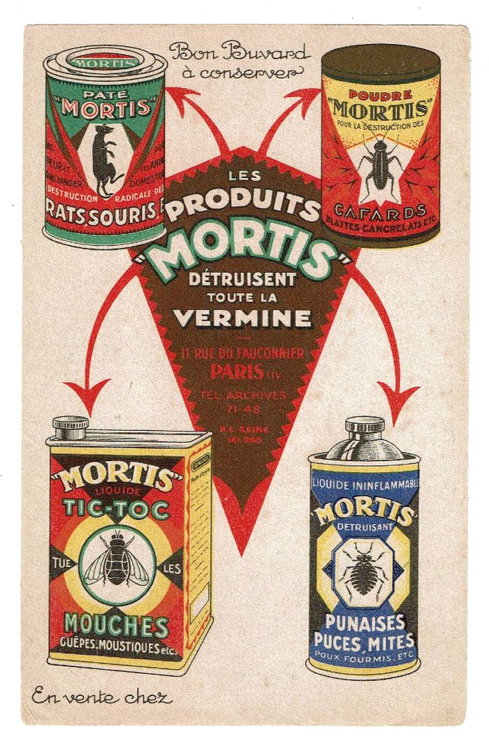 He hecho acopio de documentación gráfica de Mortis, marca de raticidas e insecticidas comercializados en Francia. Sin embargo, no he encontrado imágenes de los productos, tan solo de anuncios y materiales publicitarios. Toda la documentación encontrada es de Francia. En España tengo constancia de que se vendió el raticida Mortis por un anuncio de prensa en la que se indica que Carreño e Hijos, con sede en Francisco de Rojas, 2, Madrid, eran los depositarios de la marca [1].