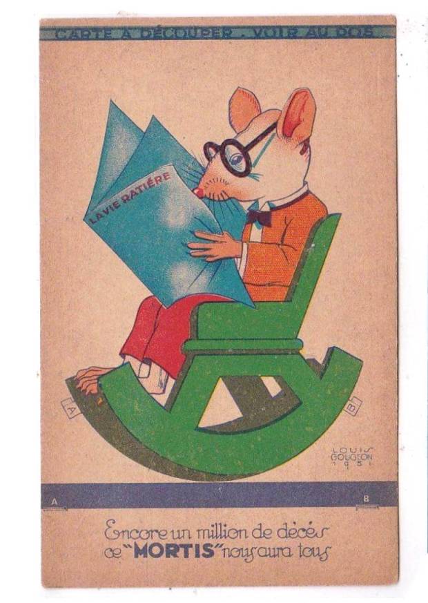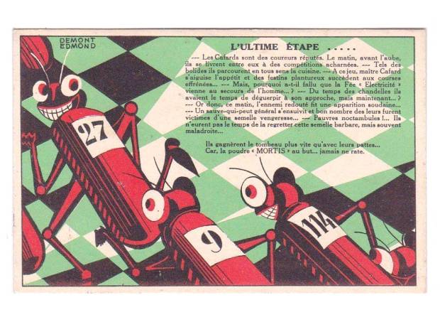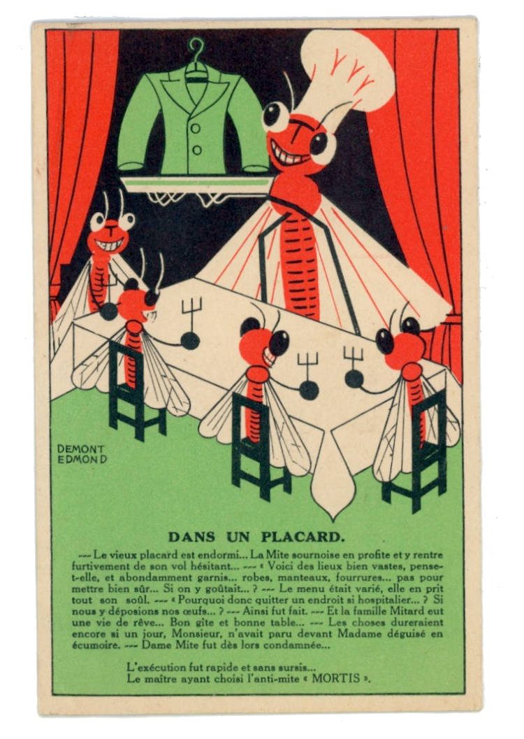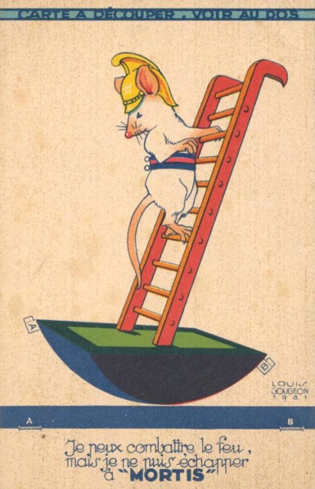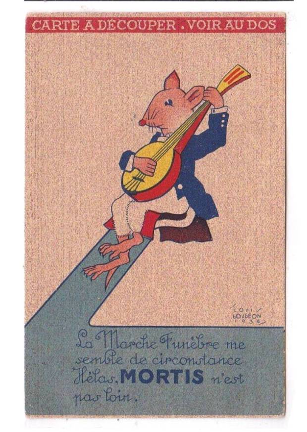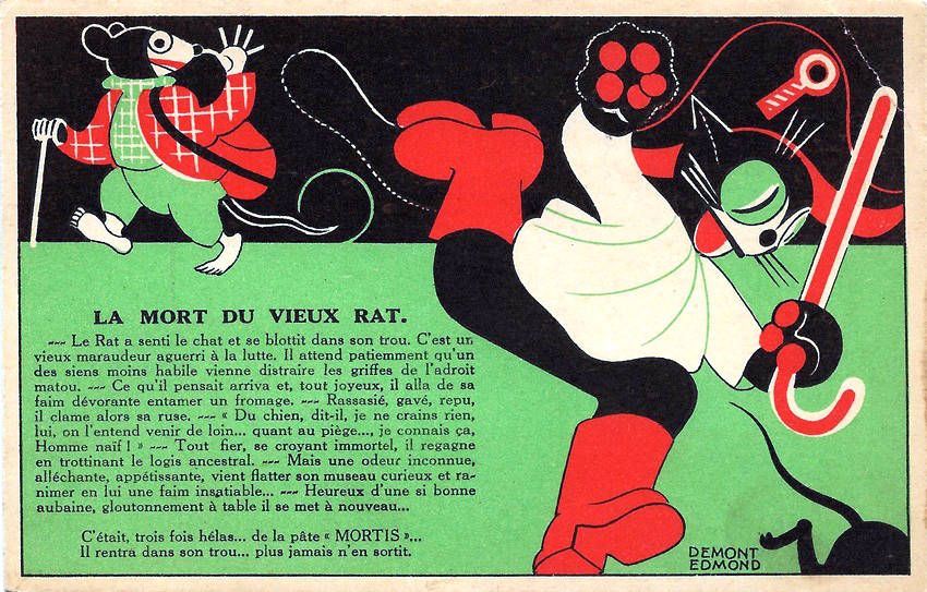 He hecho acopio de documentación gráfica de Mortis, marca de raticidas e insecticidas comercializados en Francia. Sin embargo, no he encontrado imágenes de los productos, tan solo de anuncios y materiales publicitarios. Toda la documentación encontrada es de Francia. En España tengo constancia de que se vendió el raticida Mortis por un anuncio de prensa en la que se indica que Carreño e Hijos, con sede en Francisco de Rojas, 2, Madrid, eran los depositarios de la marca [1].