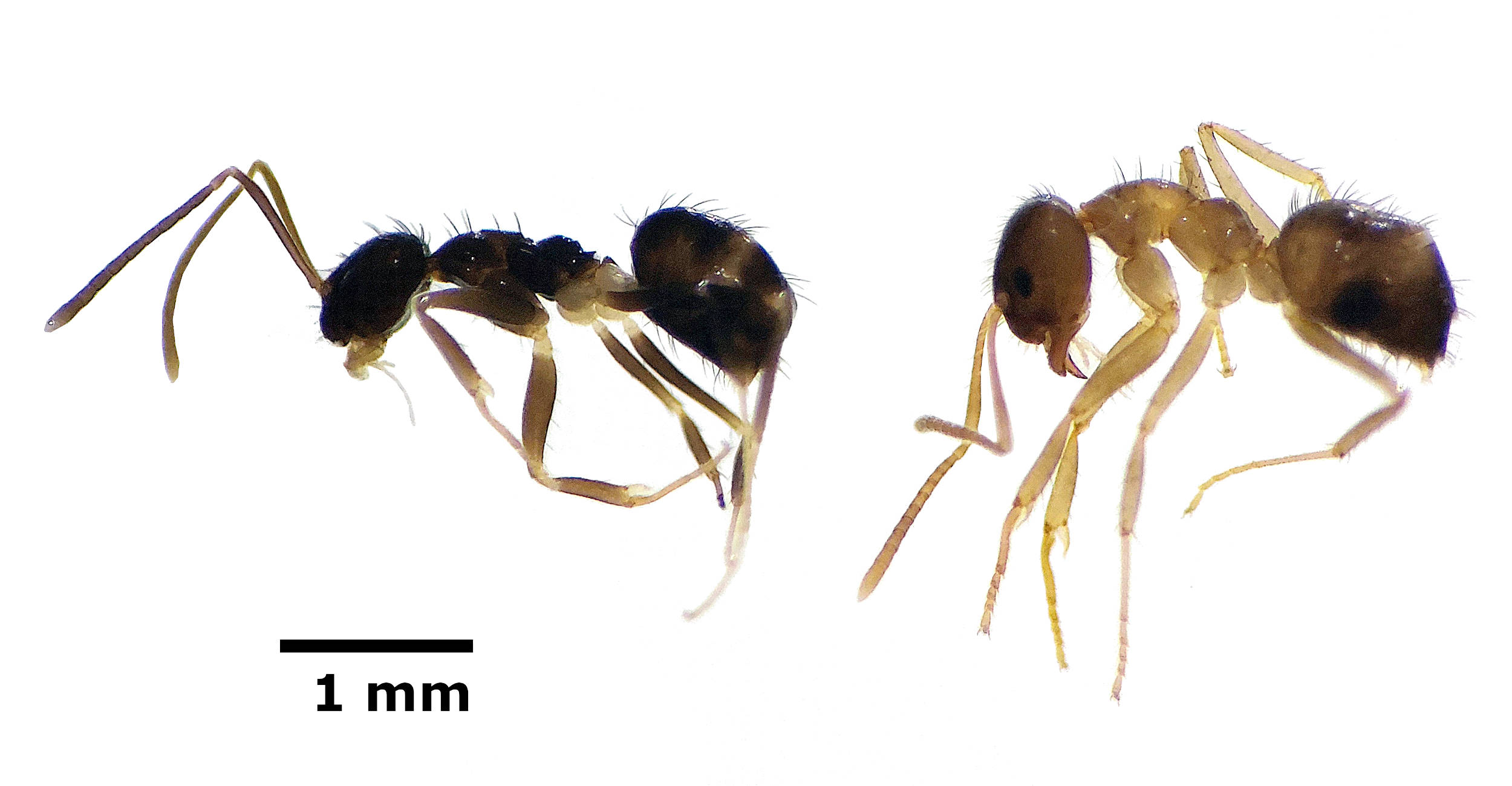 Fig 1. Nylanderia steinheili (izquierda) del Barcelona y Nylanderia jaegerskioeldi (derecha) de Marbella./ C. Pradera 12-2024