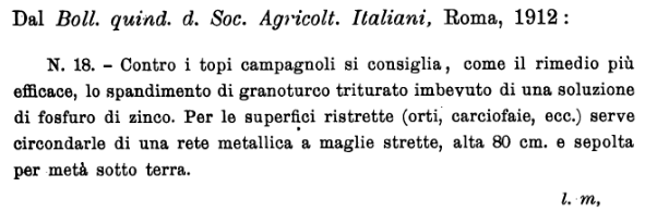 En 1912 parece que su uso era ya conocido en Italia contra micromamíferos y se consideraba el método más eficaz (figura 3) [9]. El cebo se preparaba a base de maíz triturado empapado con una solución de fosfuro de zinc que se tenía que aplicar medio enterrado y protegido con una malla de alambre para evitar la intoxicación de otros animales. En una noticia publicada en 1915 en España, sabemos que los profesores N. Passerini y C. Marchi, de la Real Academia Agraria de Florencia, utilizaron el fosfuro de zinc para controlar una «invasión de ratones campesinos» (figura 5) [10]. Su uso tuvo lugar entre noviembre de 1912 y marzo de 1913 a base de un cebo preparado con maíz y fosfuro de zinc al 1%.