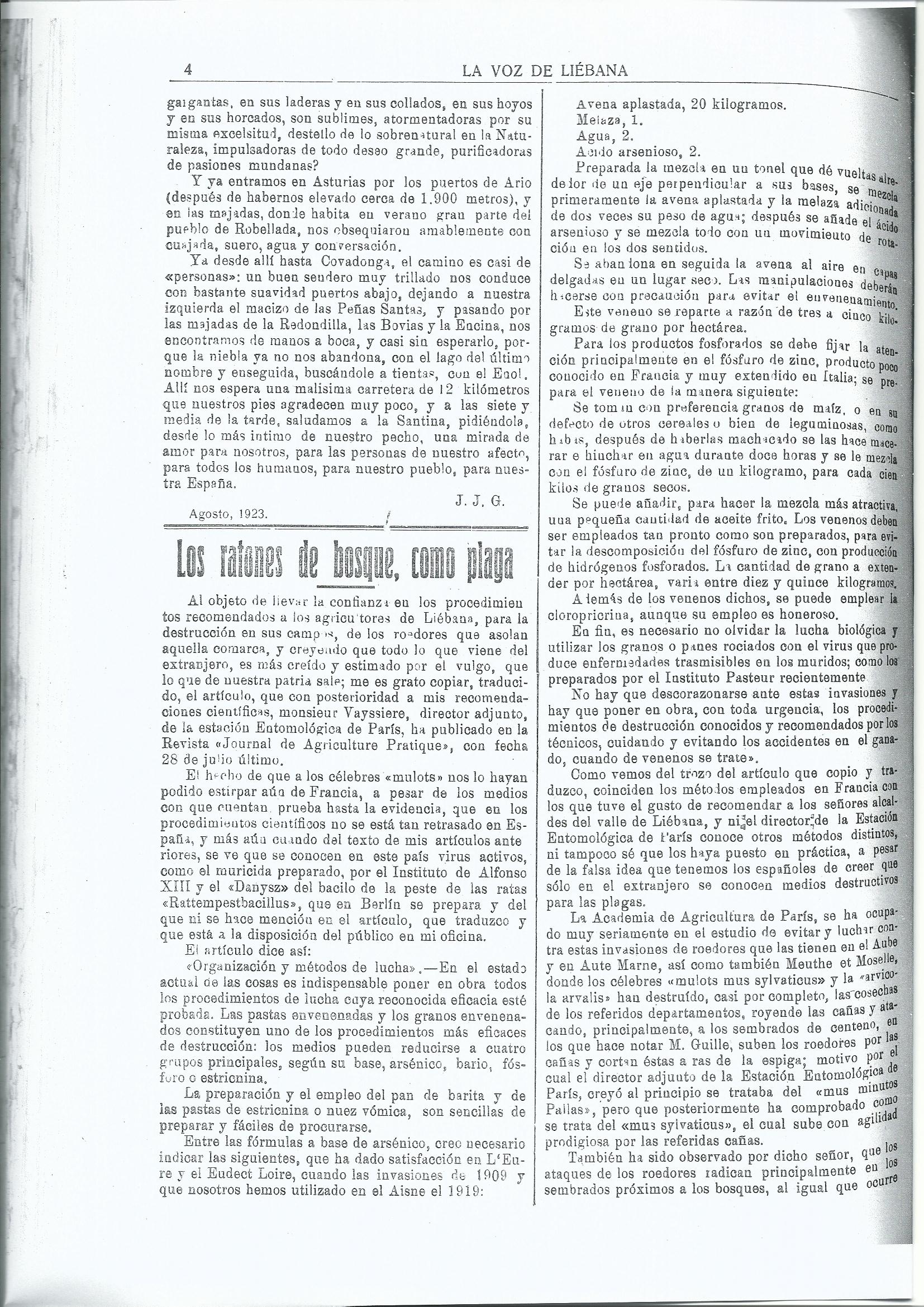 En 1923 en el periódico local ‘La Voz de Liébana’ se hacen eco de las recomendaciones científicas publicadas el mismo año en  ‘Journal d’Agriculture Pratique’ para el control de topillos y otros micromamíferos (figura 6) [11]. Se hace mención de cebos a base de arsénico, bario, estricnica y fosfuro de zinc. Se indica que en Italia está muy extendido el uso del fosfuro de zinc, poco conocido en Francia, y se promueve su uso para elaborar cebos a razón de 1 kg por cada 100 de granos secos. En España debía ser también conocido, pero poco usado. En ese año parece que fue comercializado el raticida NOGAT por Laboratorios Sokatarg de Barcelona [12]. En un artículo publicado en 1932, José del Cañizo explica el uso del fosfuro de zinc contra ratones y topillos: «El fosfuro de zinc se usa mezclado con granos enteros (avena) o triturados gruesamente (maíz, habas, partidos de arroz) y tenidos en remojo de cinco a diez horas; para cada 100 kilogramos se necesitan dos de fosfuro. Bien escurrida el agua, se echa el cebo en capas, espolvoreándolo con el fosfuro y mezclándolo bien con un palo; puede añadirse un poco de aceite frito, para hacer la mezcla más atractiva. Este cebo debe emplearse recién preparado y se distribuye igualmente cerca de los agujeros recientes, pero no dentro de ellos, porque los roedores lo rechazarían a causa del olor a ajo que desprende el fosfuro al descomponerse; tampoco debe aumentarse la dosis de fosfuro por el mismo motivo. Se repartirán de 15 a 30 kilogramos por hectárea» [13].