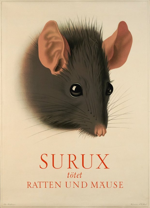 Surux apareció en el mercado en la década de 1940, pero desconozco quién lo comercializó [7]. Fue promocionado con un cartel sencillo y directo con la imagen de una rata donde aparecía una frase concisa: «Surux, tötet Ratten und Mäuse» (=Surux mata ratas y ratones) (figura 3). En la década de 1990 se comercializó la marca Neo-Surux por la compañía Stähler Suisse SA de Zofingenss. En la actualidad esta compañía comercializa contra ratas y ratones dos formulados: Surux Körner (grano con brodifacum al 0,05%) y Surux Flocken (grano chafado con brodifacum al 0,05%).