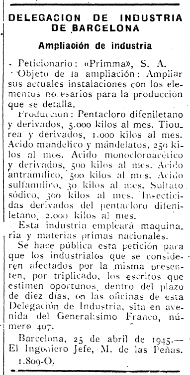 Como ‘pentacloro difeniletano’ (separado) he encontrado en anuncio del Boletín Oficial del Estado (BOE, 3 de mayo de 1945, núm. 123, pág. 1.545) en el que se autoriza a Primma SA la ampliación de sus instalaciones para aumentar su capacidad de producción (figura 4). Se justifica la ampliación con una serie de productos químicos que se quieren producir y, entre ellos, se calcula que se producirán 5.000 kg mensuales de «pentacloro difeniletano y derivados». No sé si este dato es correcto, pero 5.000 kg es mucho. En cuanto a sus derivados no sé a qué se refiere. Este dato es sumamente interesante porque he dedicado entradas a los productores de DDT en España. Y sobre quienes producían DDT en Cataluña tengo poca información.