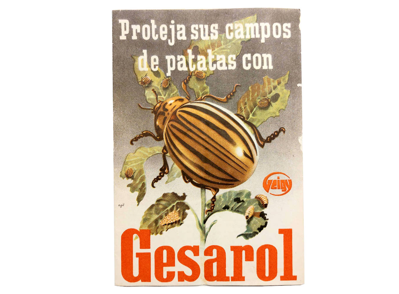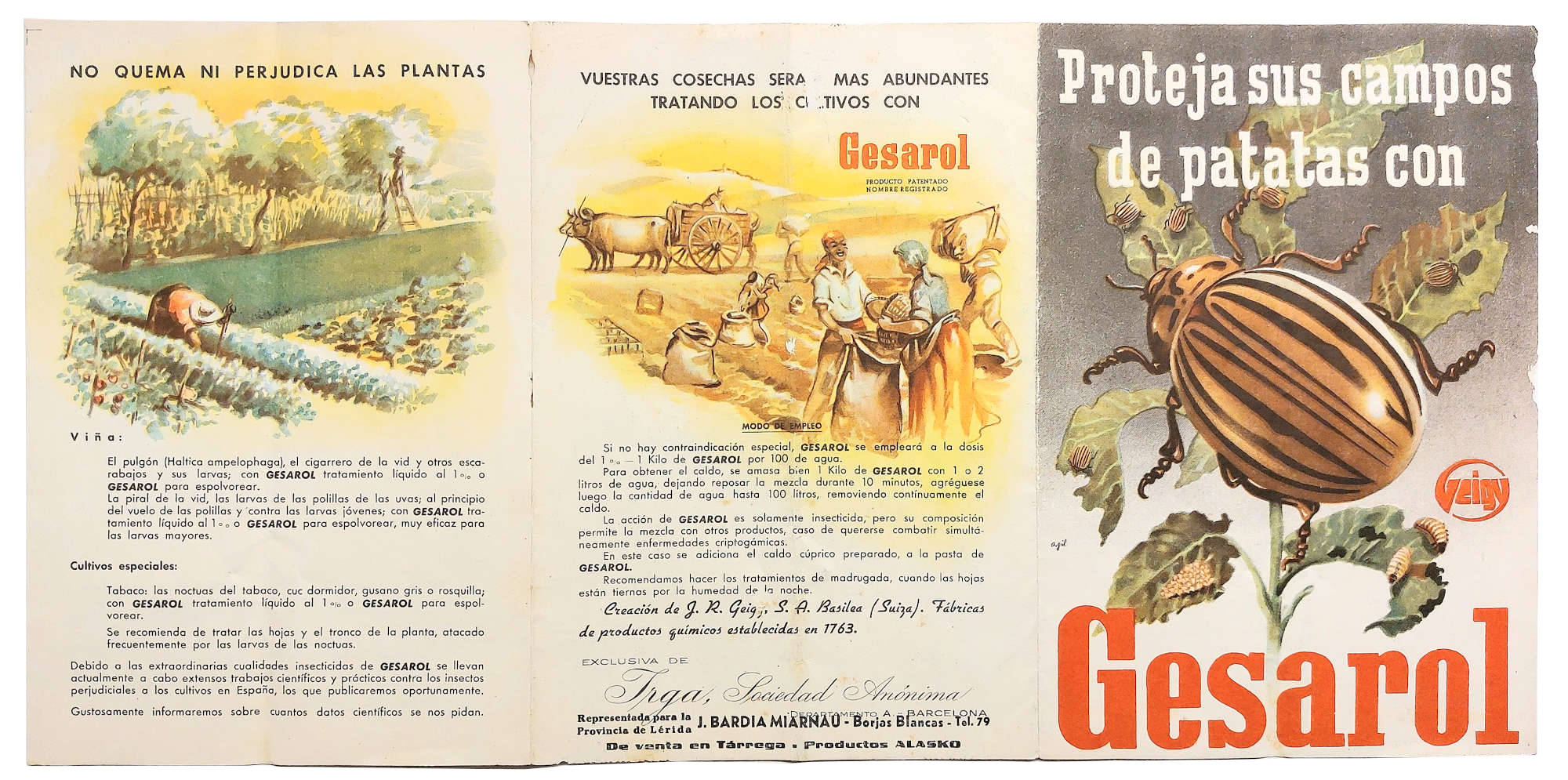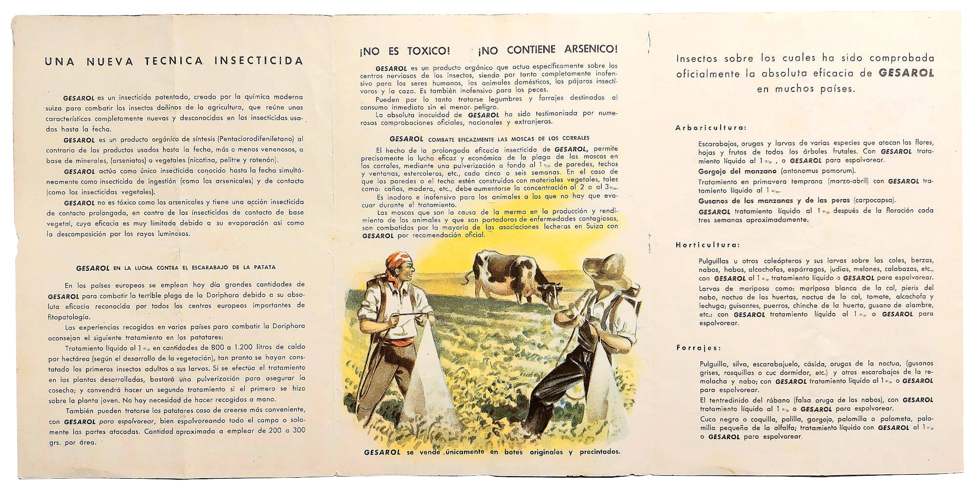 Retomo el tríptico para mostrar lo poco que sabíamos entonces. No tiene fecha, pero debió de ser publicado en 1945 o 1946. Destaco lo siguiente: «GESAROL es un producto orgánico que actúa específicamente sobre los centros nerviosos de los insectos, siendo por tanto completamente inofensivo para los seres humanos, los animales domésticos, los pájaros insectívoros y la caza. Es también inofensivo para los peces. Pueden por lo tanto tratarse legumbres y forrajes destinados al consumo inmediato sin el menor peligro». En aquella época se tenía constancia de la toxicidad de los compuestos arsenicales. Pero lo que no se sabía eran los efectos del DDT. Por tanto, en contraposición aparece en el tríptico: «¡NO ES TÓXICO! ¡NO CONTIENE ARSÉNICO!».