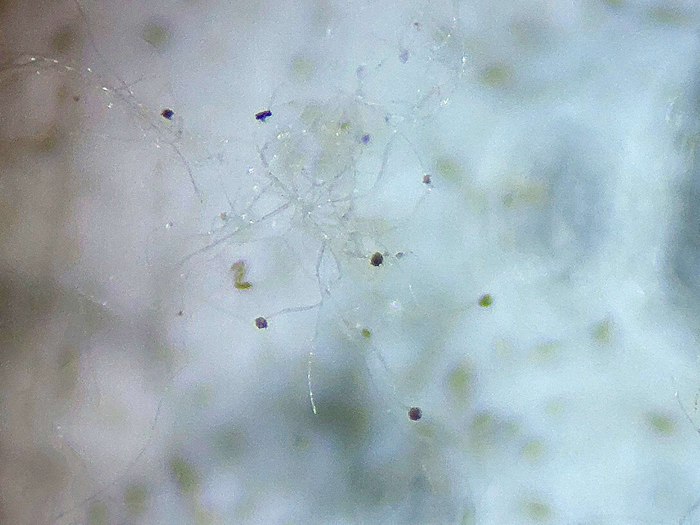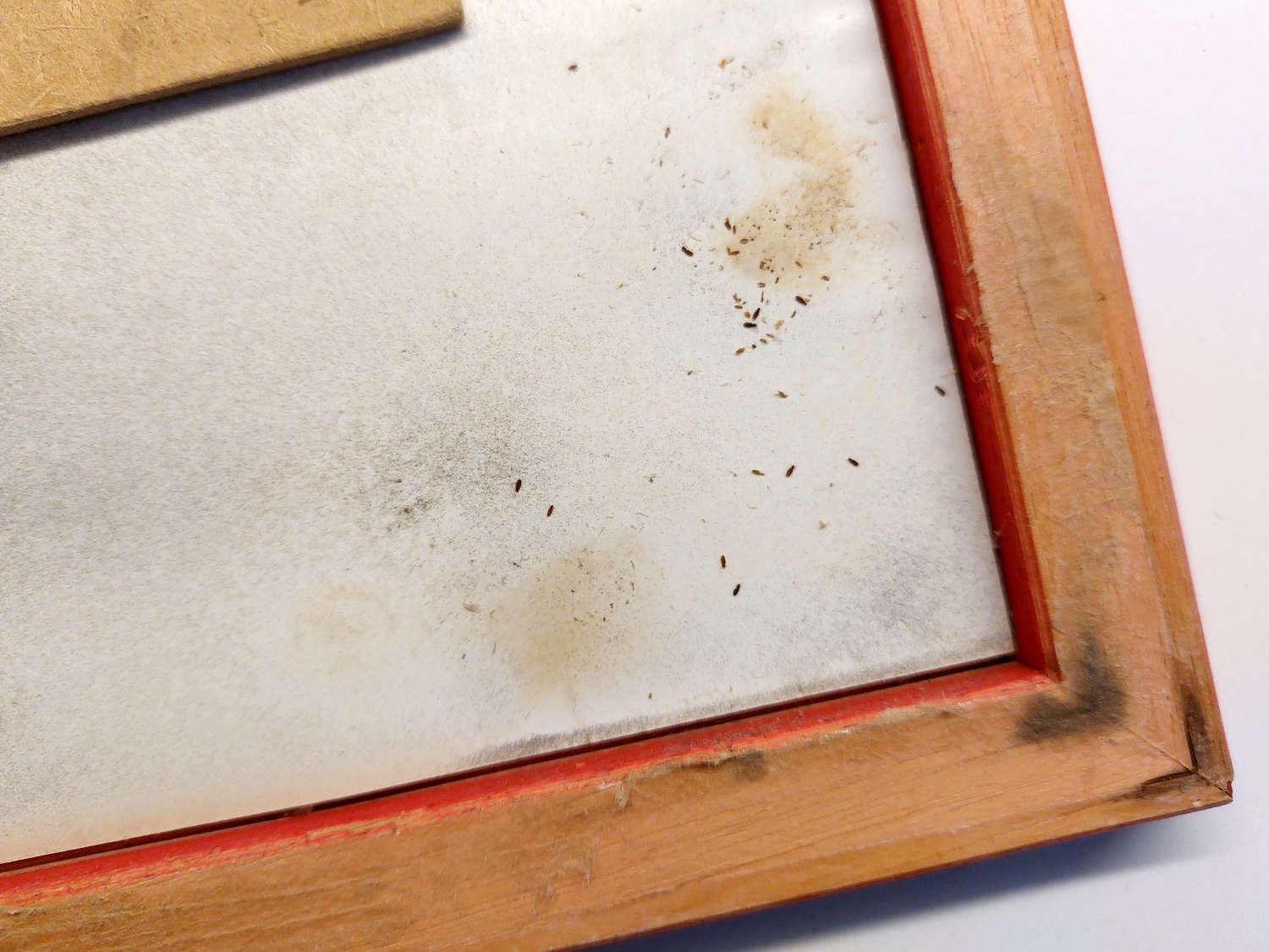 Para entender un poco su ciclo biológico, muestro el caso de un cuadro que se humedeció (figura 1). Hasta el cuadro llegaron latrídidos del género Dienerella, común en la zona donde vivo [4]. En la imagen número 2, se puede ver un adulto en vista dorsal y ventral. El cuadro estaba bien sellado por su parte posterior con una cinta de papel engomado. Se desarrollaron hongos en la parte interior en el papel, de los que se alimentaron las larvas de Dienerella (figuras 3 y 4). Algunos adultos muertos eran visibles detrás del vidrio (figura 5). En la imagen número 6, se pueden ver los excrementos de las larvas sobre la parte posterior del papel, donde se desarrollaron los hongos (figuras 7 y 8).