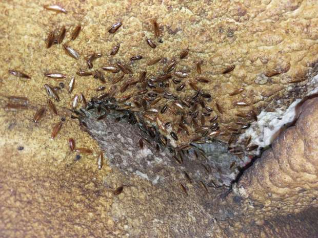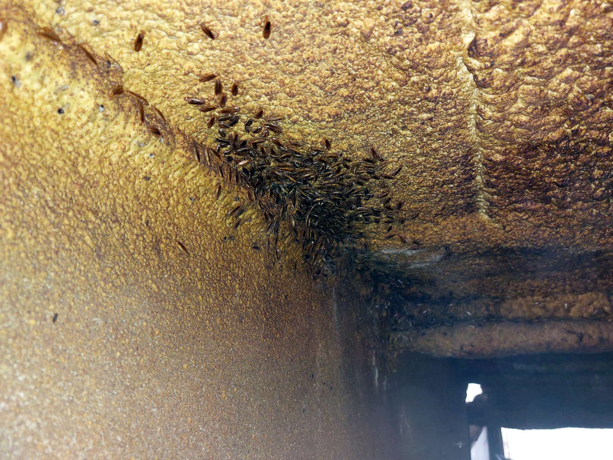 En el vídeo y en las fotografías con las que ilustro esta entrada, se ve bien la situación. Estuvimos Juan Miguel y yo haciendo un diagnóstico. Las imágenes muestran los techos llenos de cucarachas. Los techos están cubiertos de aislante (poliuretano), lo cual agradece el insecto. No se muestra otras partes de la nave como los suelos, las fosas, los separadores o los comederos donde también había muchas cucarachas. En fin, no hacen falta añadir más palabras para hacerse una idea de la situación. Y su tratamiento es complicado porque se puede bajar la población, pero no se erradica.