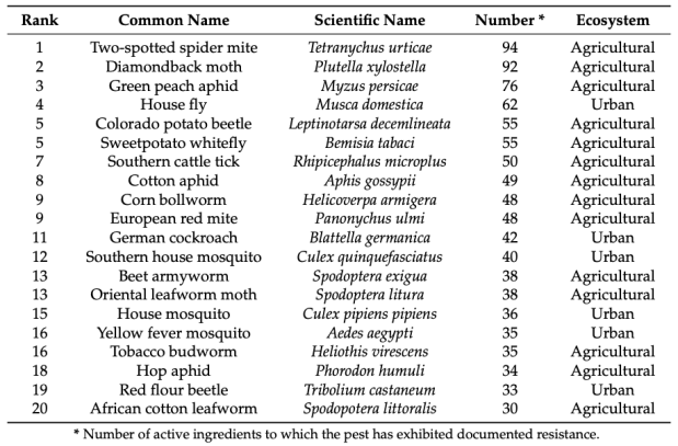 En la imagen superior, se puede ver una tabla publicada en 2016 por Zhu et al. donde se listan los 20 artrópodos que más resistencias acumulan a insecticidas [1]. Por supuesto, se trata de casos documentados de poblaciones de estas especies. Esto no quiere decir que todos los individuos de cualquiera de estas especies sea resistente, siempre y en todo lugar, a un insecticida del que tenemos un caso documentado. Pero sí sabemos que podrá desarrollar resistencia si insistimos con el mismo insecticida. La resistencia aparece al realizar una presión ambiental con un insecticida que selecciona los individuos con genes que confieren protección. Pero también sabemos que al dejar de utilizarlo, desaparece esta presión de selección y, por tanto, pueden desaparecer estos genes.