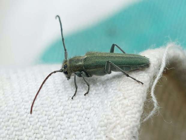 Ayer viernes, además de encontrar garrapatas, encontré otros insectos interesantes. Al pasar la bandera, a veces se quedan prendidos otros insectos como pulgones, hormigas, chinches de campo y escarabajos. En general, la mayoría de insectos se activan después del susto y salen rápido de la tela. Pero sucede con algunos insectos que se quedan posados sin moverse. Esto sucede con los coleópteros de la familia de los cerambícidos como el que muestro en las imágenes 3 a 5. Se trata de un macho de Phyotecia malachitica (=Opsilia malachitica) que medía en torno a los 10 mm de longitud. A mi parecer, quizás sean los cerambícidos los más bonitos coleópteros.
