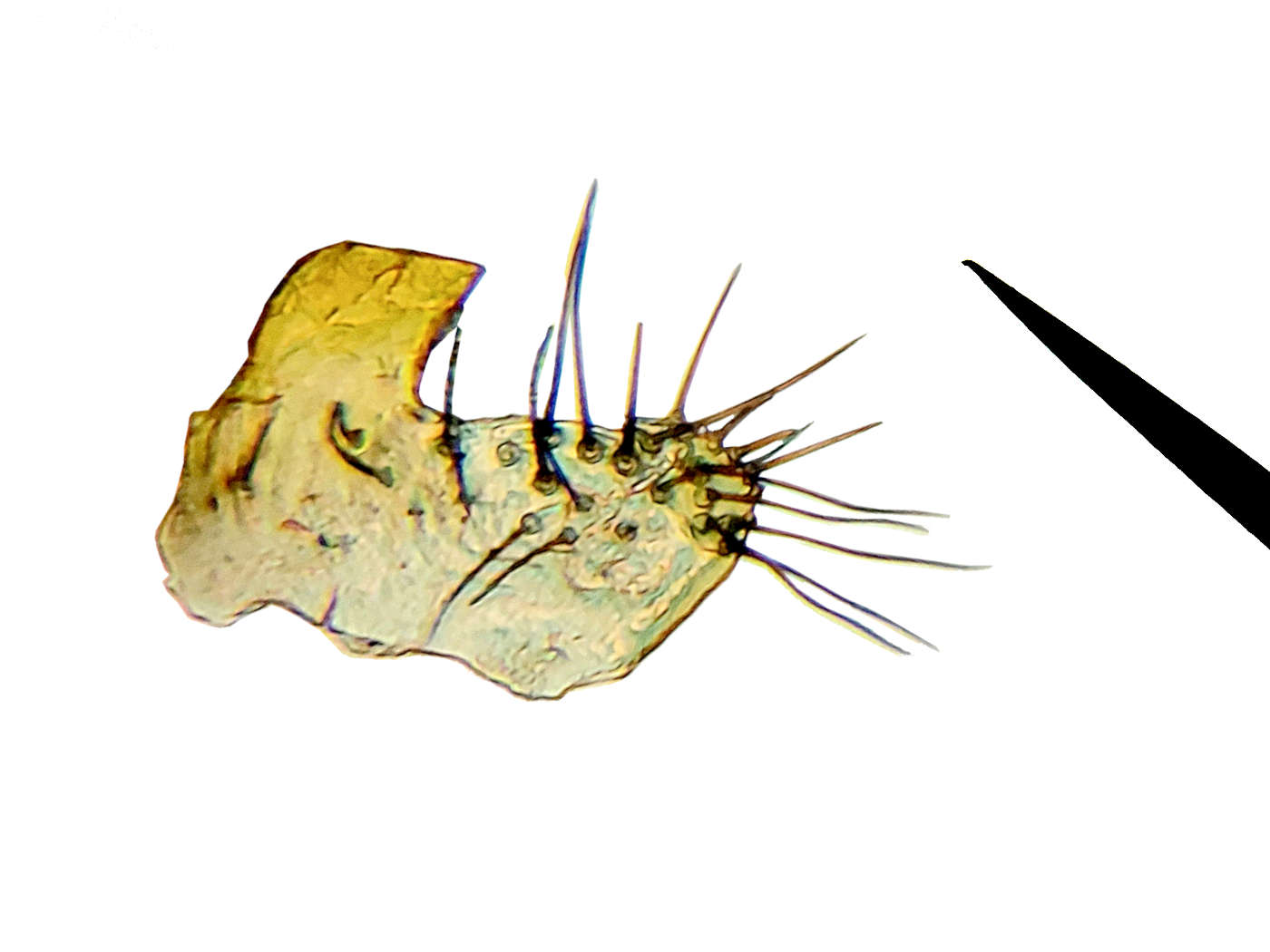 Empiezo por Drosophila (Dorsilopha) busckii, de la que capturé unos 16 individuos (figuras 1 y 2). Es una especie común y fácil de identificar por las líneas oscuras en el tórax. He dedicado una entrada en el blog al ser habitual encontrarla en insectocaptores [3]. Luego tenemos Drosophila (Sophophora) melanogaster y Drosophila (Sophophora) simulans que denominamos moscas del vinagre. La primera es más habitual en interiores. Para su identificación es necesario la captura y observación con lupa binocular [4]. Son muy parecidas. Las hembras son difíciles de diferenciar (índice costal), pero no en cambio los machos por la forma de la genitalia (figuras 4 y 5) [5]. En la imagen número 3 se puede ver un macho de cada especie. Con práctica se pueden apreciar diferencias en la coloración oscura en el abdomen. Como se puede ver hay dimorfismo sexual.