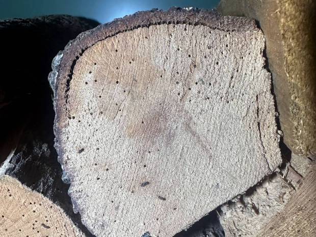 El segundo caso fue gracias a mi compañera Lorena Piñero quien encontró una infestación de pequeñas carcomas en leña decorativa en un cliente situado en la parte sur de Barcelona. Recolectó una muestra y la identificamos como Trogoxylon impressum [4]. En las imagen número 2 se puede ver los ejemplares recolectados por Lorena. Los líctidos se caracterizan por tener un cuerpo estrecho, lo cual facilita su identificación en primavera a través de fotografías. En la imagen número 3, se puede ver una representación de los ejemplares más grandes y más pequeños recolectados. Miden poco más de 1 mm de ancho. En las imágenes 4 y 5 se puede ver los agujeros de salida en los tizones infestados de este caso.