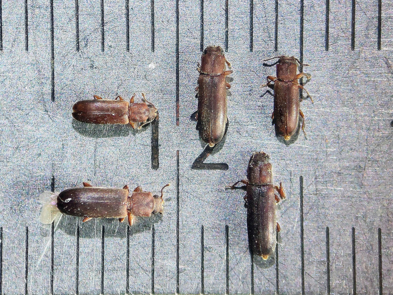 La primera vez que vi este líctido fue gracias a Adrià Miralles que tuvo un caso muy interesante en madera obrada de higuera [5]. Los líctidos no atacan cualquier madera, se especializan por unas especies concretas de frondosa. Atacan la albura de maderas con vasos de gran diámetro (>0,07 mm) y con contenido de almidón superior al 1,5% [6]. Conocida es la polilla del parquet (Lyctus brunneus) que tantos destrozos comete en suelos de roble. En la actualidad, poco tiene que atacar porque el parquet sintético es lo que abunda. Atrás queda la moda de la década de 1980 cuando lo normal eran maderas nobles en suelos.