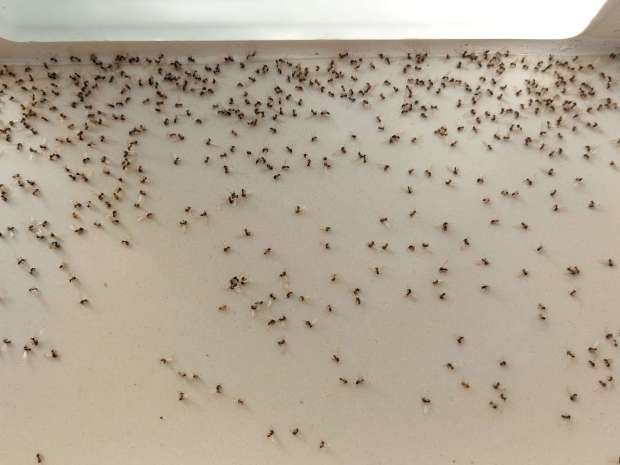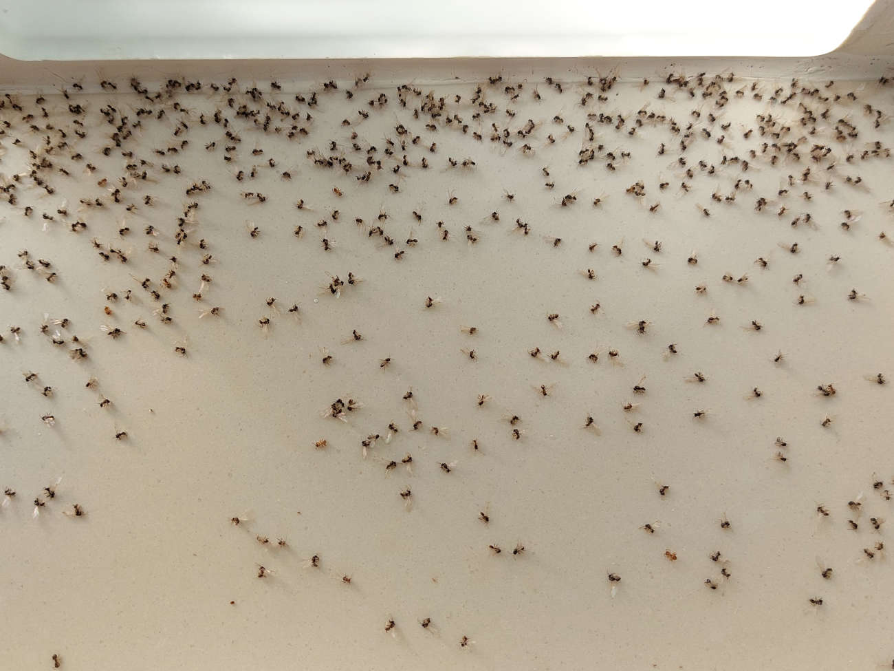 Recientemente estuve en un cliente donde llevan unas semanas apareciendo machos en el baño de una vivienda rodeada de jardín. La colonia se encuentra instalada en una zona del jardín pegada a la vivienda. Ocupa unos 20 m2 en exclusiva donde ha desplazado otras especies como Lasius grandis, Myrmyca sp. o Tetramorium sp. El problema es que el baño se encuentra en una zona soleada donde L. neglectus está a gusto. Y seguramente haya llevado a esa pared las pupas, lo cual es habitual en hormigas. Los machos emergen cada día hacia el atardecer, pero en vez de hacerlo en el exterior, lo hacen en el interior. Además el baño está en el dormitorio principal por lo que es una auténtica molestia que impide su uso.