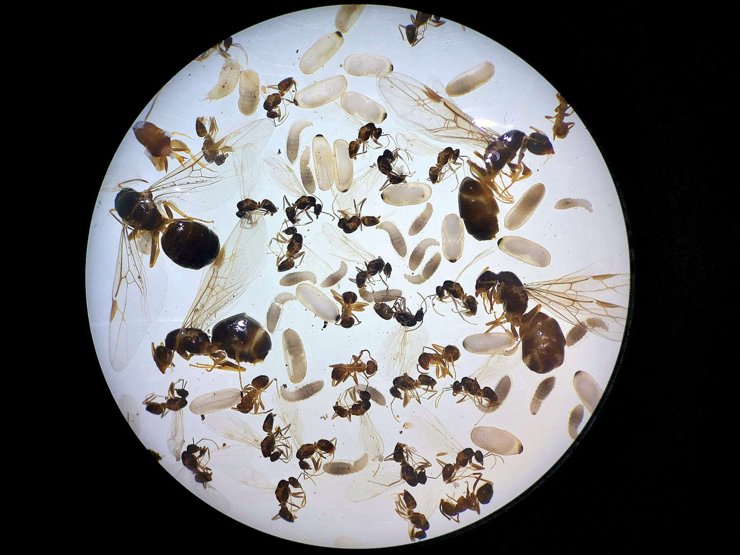 En el exterior, encontré bajo el césped artificial reinas con alas, además de larvas, pupas, obreras y machos (figura 3). Sin embargo, aunque tienen alas, las reinas no las usan en el vuelo nupcial, ya que nunca se ha visto [2]. Aunque sí parece que los machos emprenden un vuelo torpe como sucede con especies con Linepithema humile, siendo la cópula intranidal. Sabemos que las especies invasoras con estructura supercolonial se expande por gemación. Las reinas grávidas se van del hormiguero junto a obreras para fundar uno nuevo. Esto les permite expandirse poco a poco asegurando el terreno. Lo que también sabemos es que llegan gracias al transporte de plantas.