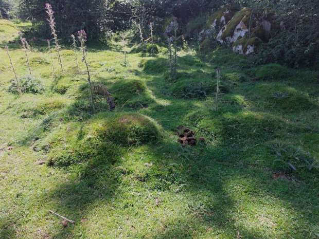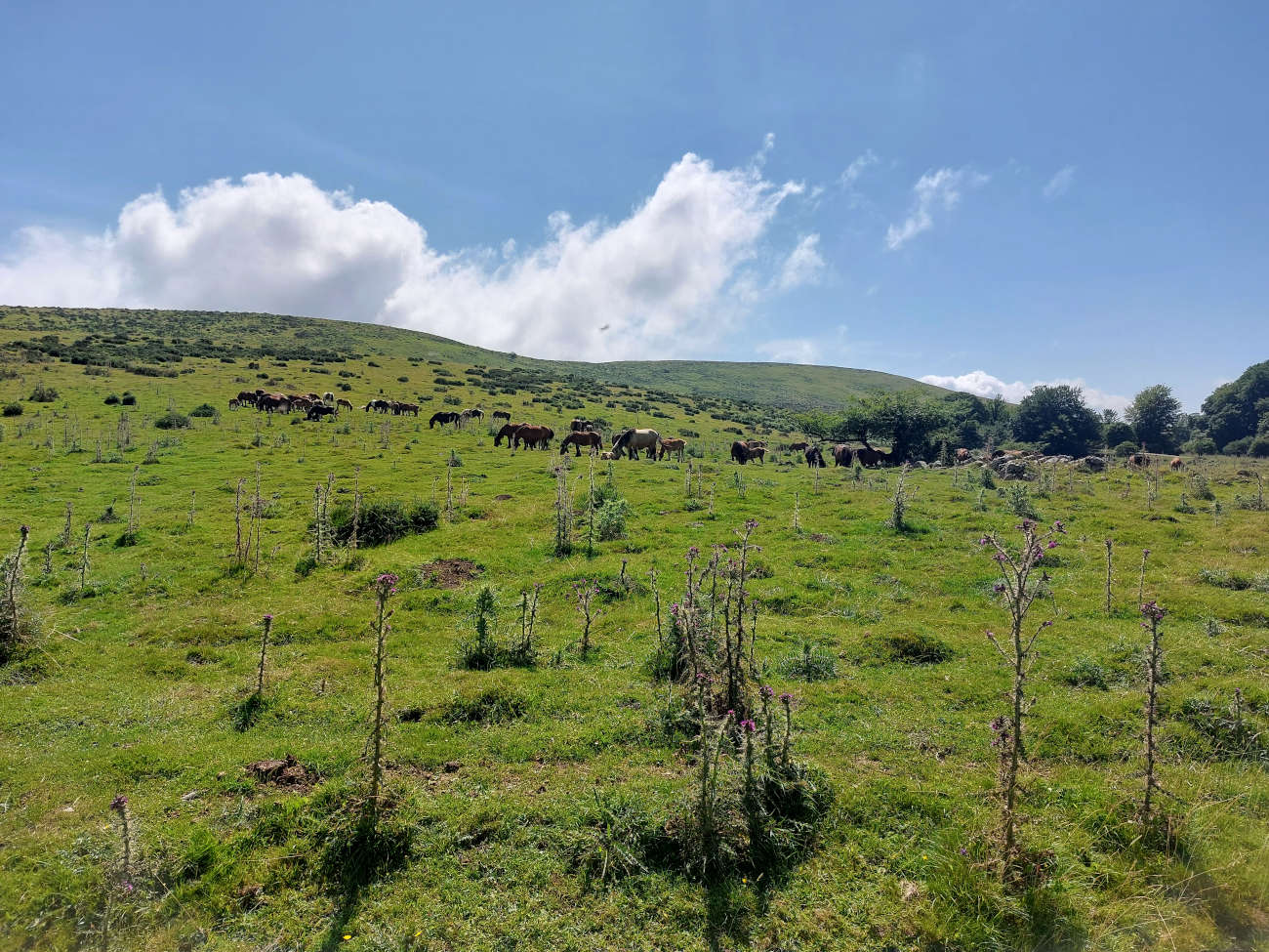Ahora bien, esta área abierta es de carácter antrópico, ya que los humanos la hemos modificado para el ganado desde tiempos muy lejanos. Lo que vi fue ganado vacuno y caballar. Esta modificación del suelo impide el crecimiento de arbustos, árboles y otras plantas que impedirían que el suelo fuera una alfombra de hierba. La presencia de ganado, además de permitir que las hormigas instalen allí sus montículos, creo que juega un importante papel por los abundantes excrementos. De hecho, aportan nutrientes en forma de larvas de dípteros, coleópteros y otros insectos que cumplen su ciclo sobre tan nutritivo sustrato. Debajo de algunos excrementos, pude ver obreras de Lasius flavus.