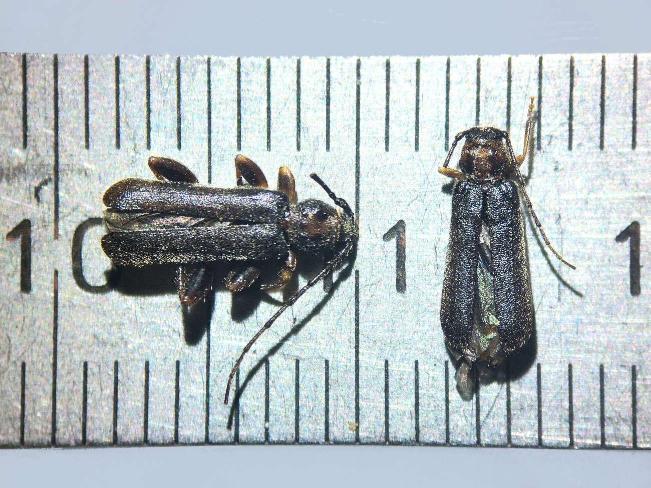 En la imagen número 1, se pueden ver cinco ejemplares de Phymatodes lividus. Están un poco descompuestos, pero no lo suficiente como para su identificación. De su estado soy responsable porque Eric capturó dos vivos. Pero pasaron por varias manos y me llegaron en tal estado. En la imagen número 2, nos podemos hacer una idea de sus dimensiones. El más grande de los cinco, medía 9 mm. En los manuales apuntan una longitud de 5-10 mm [2].