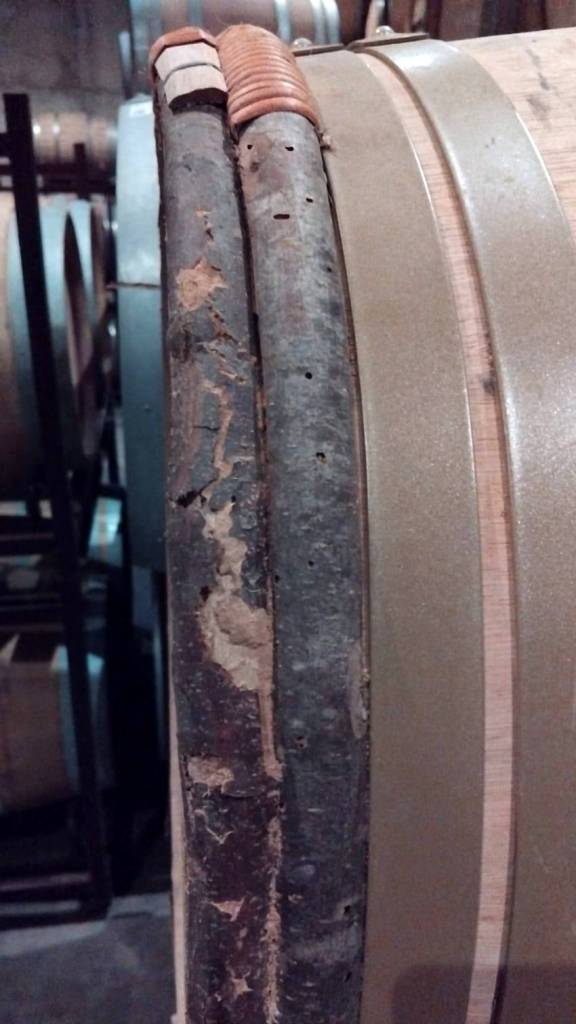 En las imágenes 3 y 4 se puede ver la afectación que encontró Eric en toneles de vino. Al realizar la revisión de control de plagas en una bodega de Tarragona, los responsables le pidieron que tenían carcoma y qué se podía hacer. En ese momento estaban saliendo los adultos y los responsables estaban muy preocupados por si podía afectar a la madera de roble de los toneles. Tras una inspección detallada, vimos que la afectación estaba en unos aros de madera añadidos a los toneles. En la imagen número 3 se pueden ver dos aros añadidos en el extremo de uno de los toneles. Tienen agujeros de salida de unos 3 mm de diámetro. Lo que no hemos sabido es por qué los toneles tenían estos aros añadidos ni la especie vegetal.