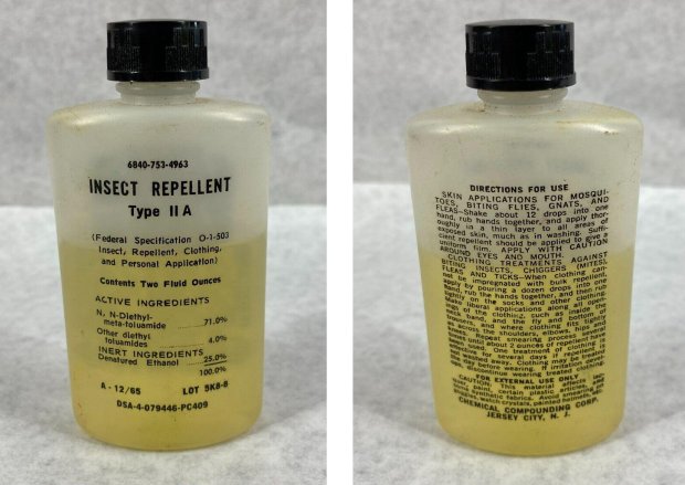 Ahora bien, es interesante que en la lata se indican unas medidas de precaución (caution). Se recomendaba un límite de 60 gramos (una lata de 2 onzas) por persona y tratamiento. Y en caso de ser necesario un segundo tratamiento, no se recomendaba hacerlo antes de una semana (7 días), seguramente para evitar una intoxicación. En la actualidad el lindano es un compuesto orgánico persistente (COP) que se bioacumula y tarda mucho en eliminarse del organismo. Es también interesante que en la lata se indica que no debe ser usado a la vez que se usa un repelente de insectos o bien cualquier otro producto aplicado sobre la piel. En la contienda de la Guerra de Vietnam, el producto utilizado como repelente era la N,N-Dietil-meta-Toluamida (DEET) , que fue descubierta por el ejército de los EUA y empezado a utilizar hacia 1946 (figura 3). Vietnam es un país de clima tropical donde hay mosquitos a mansalva. Las enfermedades transmitidas por mosquitos eran la primera preocupación entonces. Y no había soldado que no llevara un envase con DEET. Hay fotografías donde el envase era llevado por los soldados sujeto al casco por una cinta. El DEET de por sí es tóxico si se usa muy seguido. Mezclado con el lindando, posiblemente provocó alguna intoxicación.
