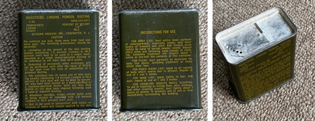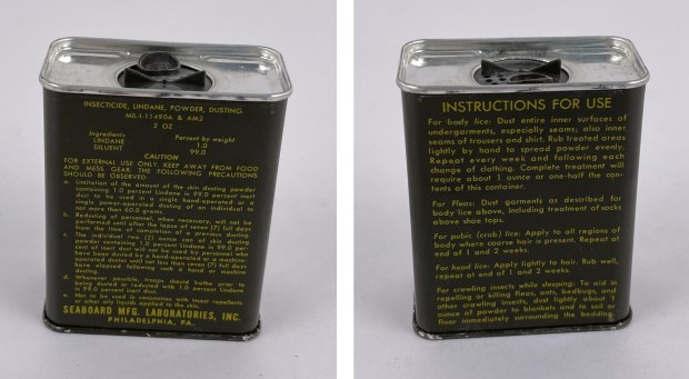 Se puede comprender la toxicidad que tiene el lindano respecto al DDT simplemente teniendo en cuenta la composición de las latas del ejército estadounidense. Como antiparasitario de uso tópico, el DDT estaba formulado al 10%, mientras que el lindano lo contenía al 1%. Por lo que he encontrado, las latas con lindano fueron usadas por los soldados que participaron en la Guerra de Vietnam [4]. Desconozco si antes estaban disponibles. El producto tenía el nombre de «INSECTICIDE, LINDANE, POWDER, INSECTICIDE» (figuras 1 y 2). Estaba indicado contra piojos del cuerpo (body lice), pulgas (fleas), ladillas (pubic (crab) lice), piojos de la cabeza (head lice) y para cualquier otro insecto rastrero que perturbara el sueño como las chinches de cama (crawling insects while seleeping). Su uso contra ectoparásitos no tiene mucho misterio. Consistía en impregnarse el cuerpo allá donde fuera necesario: cuerpo, cabeza, zona púbica, etc. Y para proteger la cama de los insectos rastreros, se recomendaba espolvorear con una capa muy fina el suelo.