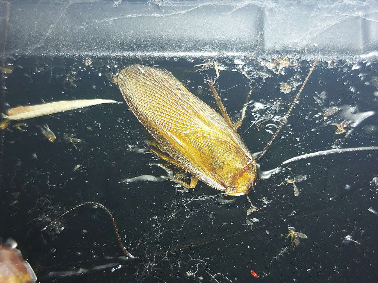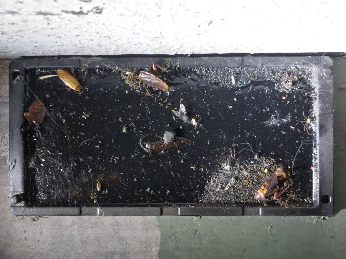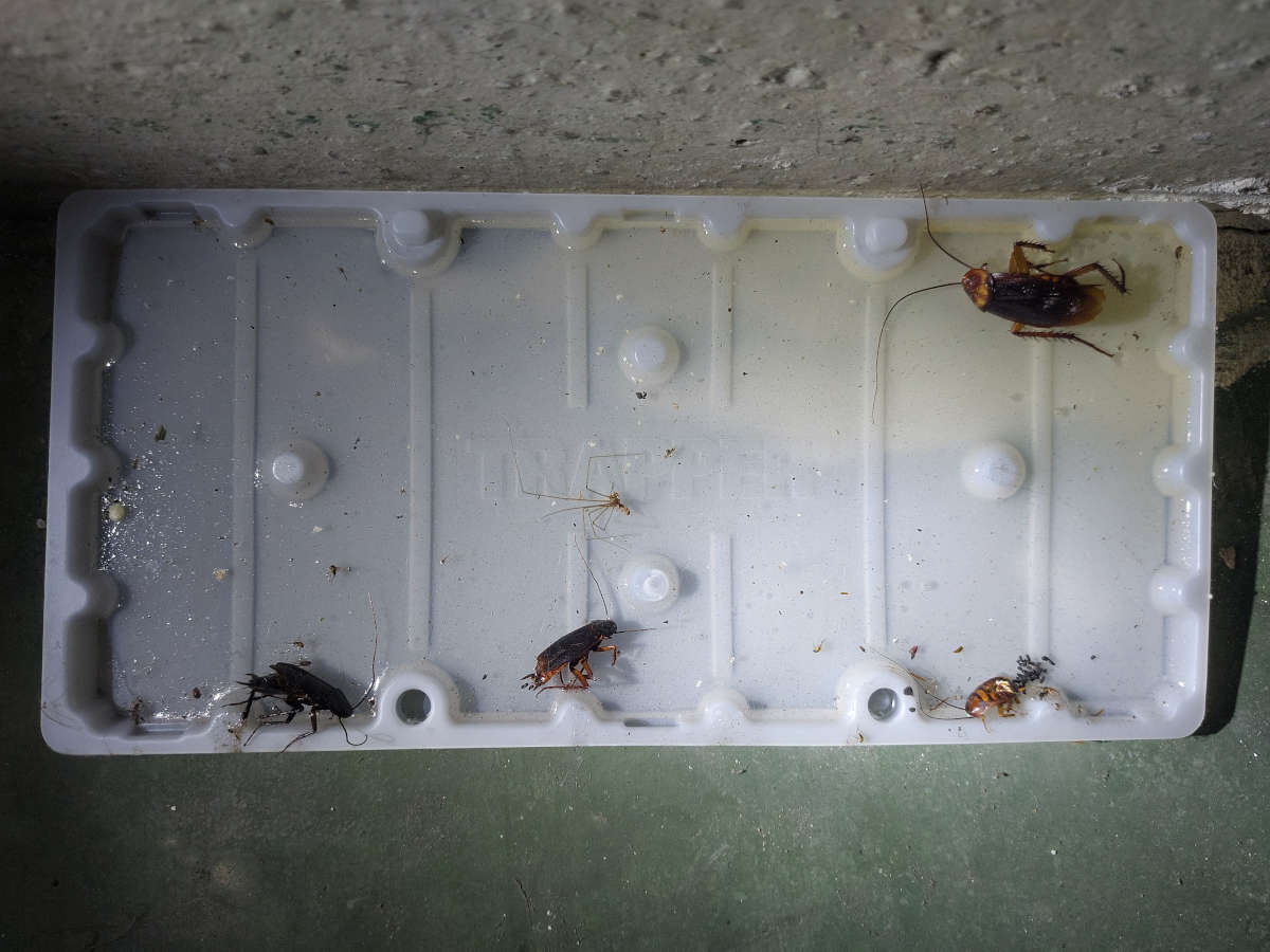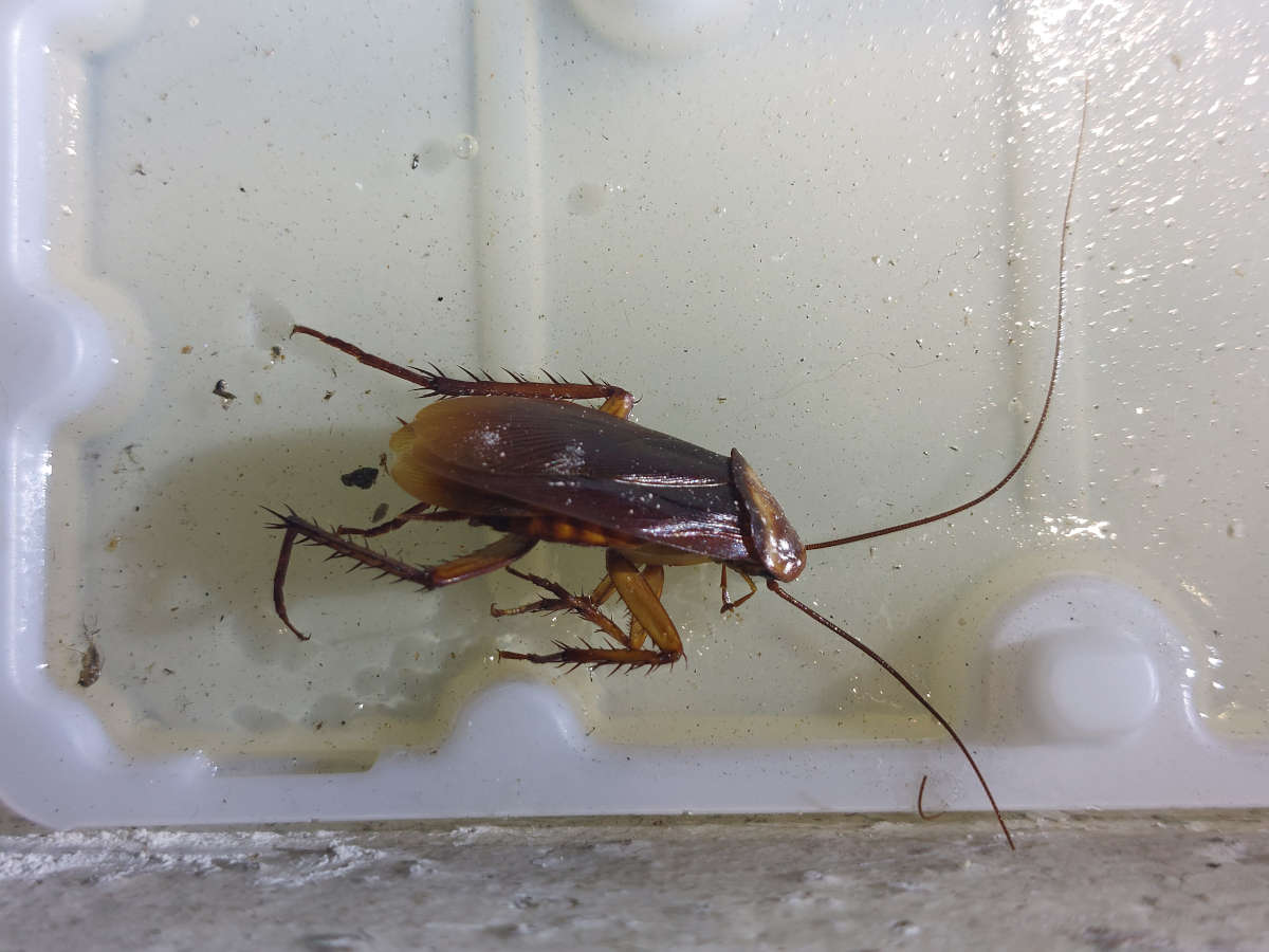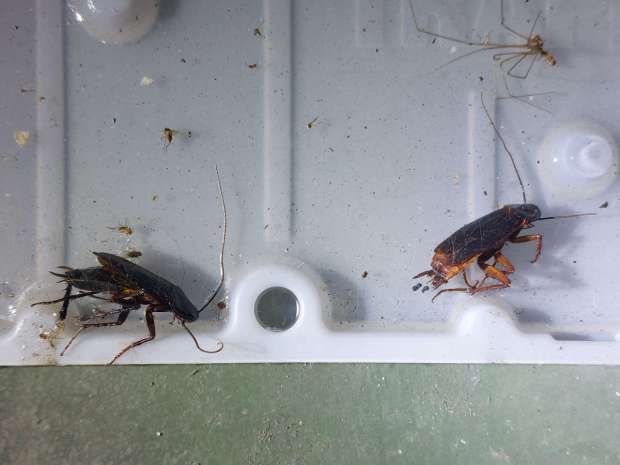 Fig 2. Trampa de captura con ejemplares de Periplaneta americana y 1 ejemplar de Periplaneta lateralis./ C. Pradera 9-2025