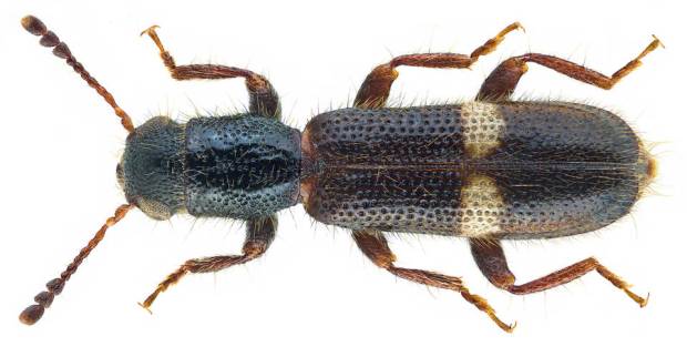 Albouy y Richard incluyen esta especie en su guía sobre coleópteros y nos dan unos interesantes datos [2]. Los adultos miden 3-5 mm de longitud, por lo que son muy pequeños. Pero lo suficiente para introducirse por las galerías de pequeños xilófagos y darles caza. De color oscuro, se caracteriza por la banda transversal y blanca a mitad de los élitros que aparece interrumpida. El pronoto es alargado y casi tan ancho como la base de los élitros. Sobre su ecología, los autores indican que es cosmopolita y probablemente haya sido importada en Europa en el pasado con el comercio de madera. Indican que está ampliamente distribuida por Europa. Comentan que es común en aserraderos y almacenes de madera donde da caza a carcomas del género Lyctus. Este dato es importante, porque las sillas eran de madera de frondosa según indicó Marta Galdiano. Pero no sabemos nada de la especie xilófaga.