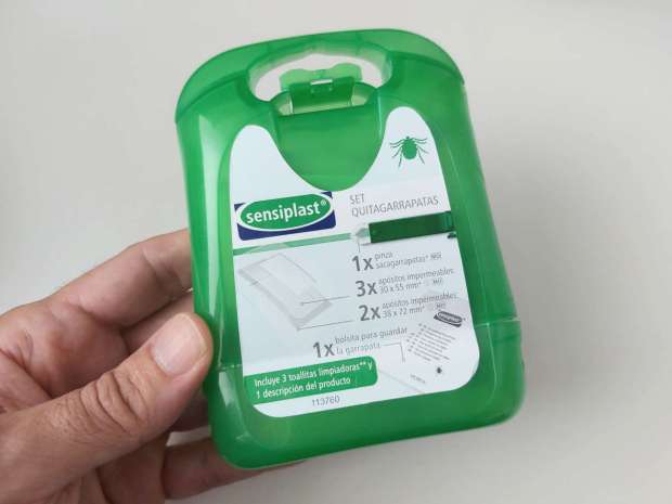 Tiene la forma de un estuche o pequeño maletín (13×10 cm) con espacio suficiente para incluir lo esencial. Contiene 1 pinza sacagarrapatas, 3 apósitos impermeables 30×55 mm, 2 apósitos impermeables 38×72 mm, 3 toallitas limpiadoras, 1 bolsita para guardar la garrapata y un manual de instrucciones (figura 3). He de apuntar que lo que más me ha gustado es la bolsita para guardar garrapatas. Uno siempre piensa en guardar la muestra para su identificación.