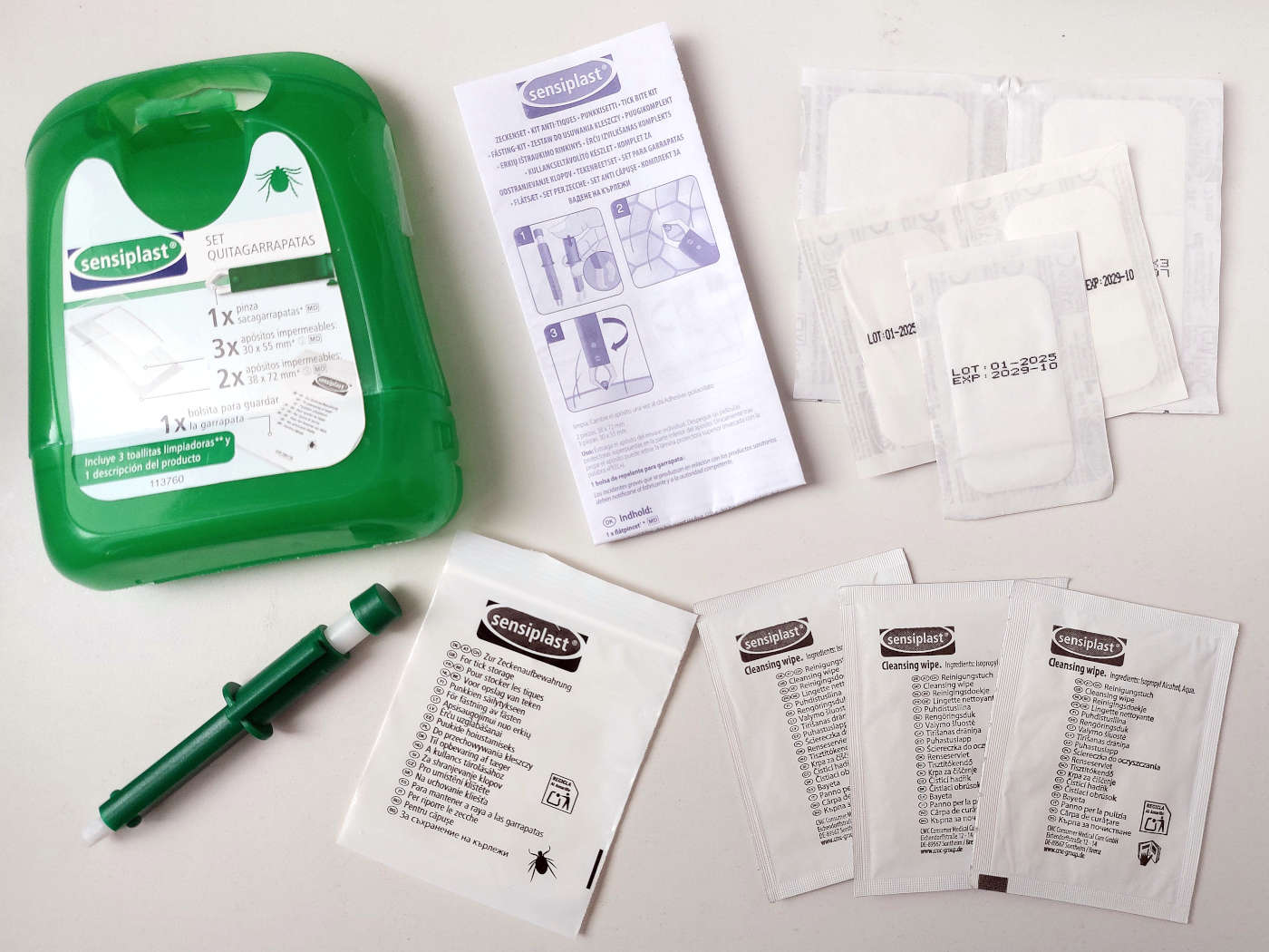 Quiero agradecer a mi amiga Laura Fornza que me diera a conocer el producto que muestro en esta entrada. Ella lo encontró a la venta en LIDL hace unos meses. Pensó en mí y lo adquirió. Se lo agradezco mucho. Es la primera vez que veo un minibotiquín para retirar garrapatas adheridas. Lo normal es encontrar a la venta repelentes, pero no este producto con lo esencial para quitar garrapatas y hacer una primera cura (figuras 1 y 2). Se vende como Set Quitagarrapatas de la marca Sensiplast [1].
