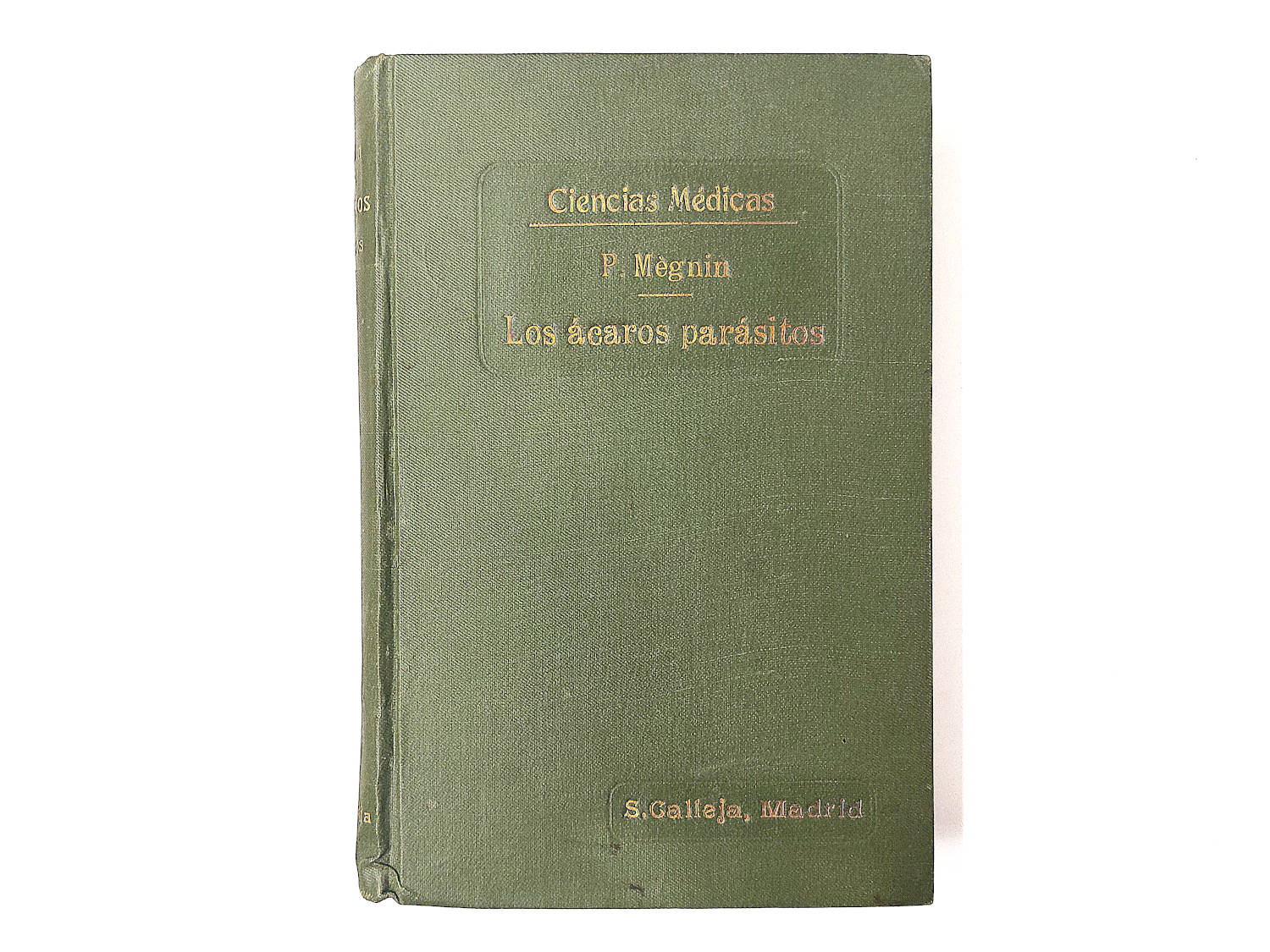 Dos años antes a la obra comentada, en 1892 Mégnin publicó el libro ‘Les acariens parasites’ [4]. Es también una obra relevante puesto que lista los ácaros parásitos, un campo poco estudiado y que necesitaba de una obra de divulgación. Hace unos meses adquirí la primera edición en español que tradujo Pedro Pérez Sánchez, veterinario militar como Mégnin, para la casa editorial de Saturnino Calleja de Madrid. No consta el año de publicación en España, pero según he investigado debía ser a principios de la década de 1910. La edición es muy buena con una cubierta dura con inscripciones doradas.