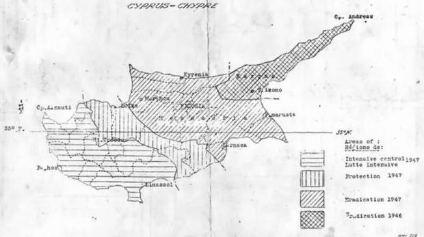 El plan Aziz consistió en dividir la isla en 556 bloques formando una cuadrícula. Cada una de ellas podía ser cubierta por un solo hombre en 12 días. La campaña empezó en el este para ir avanzando hacia el oeste (figura 2). El plan era tratar cualquier superficie capaz de albergar larvas de mosquitos Anopheles con una fina película de DDT al 4-5% en gasóleo [3]. El efecto residual del DDT era superior al verde París (acetoarsenito de cobre) utilizado habitualmente en esta clase de tratamientos. A medida que avanzaba la campaña, iban quedando zonas limpias en las cuales solo se podía entrar previo tratamiento insecticida. Cualquier vehículo o transporte recibía una pulverización con insecticida para evitar que penetraran de nuevo los mosquitos [1]. Toda película de agua era tratada, incluso se bajaba a cuevas y se trataban las huellas de los animales. El DDT, una nueva sustancia activa muy residual, marcó la diferencia con todo lo hecho anteriormente. Tras un trabajo intenso de aplicación de insecticida, en febrero de 1952 Chipre fue declarado primer país libre de malaria [4]. La lucha contra la malaria implicó el uso de 46 toneladas de DDT y la participación de 770 chipriotas [3].