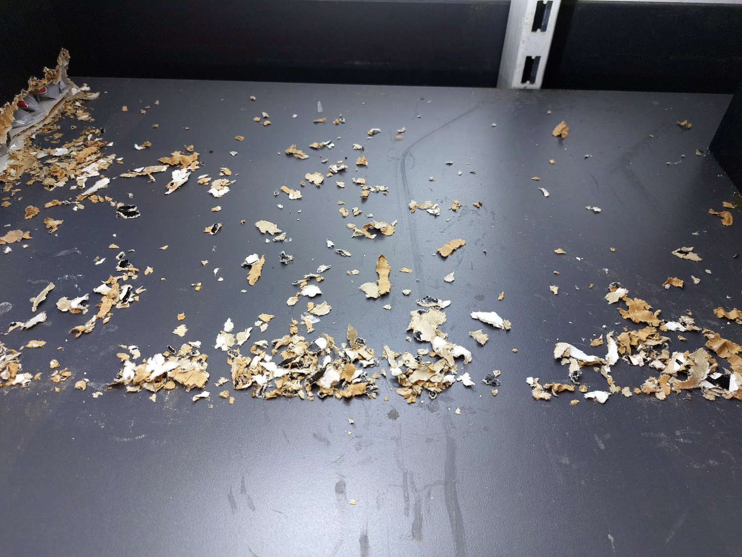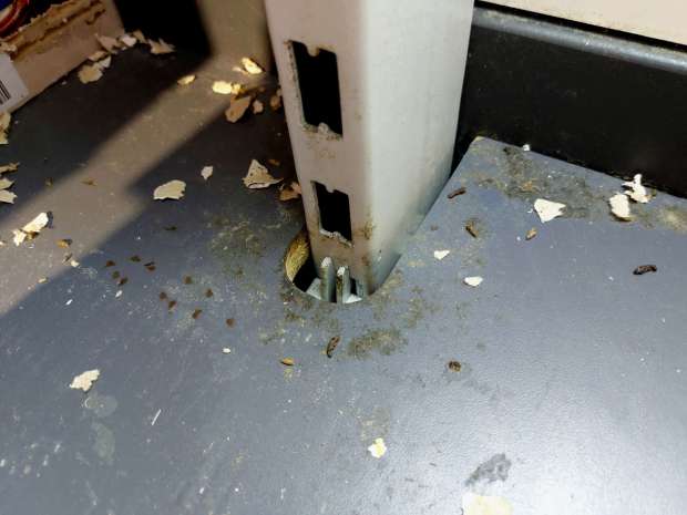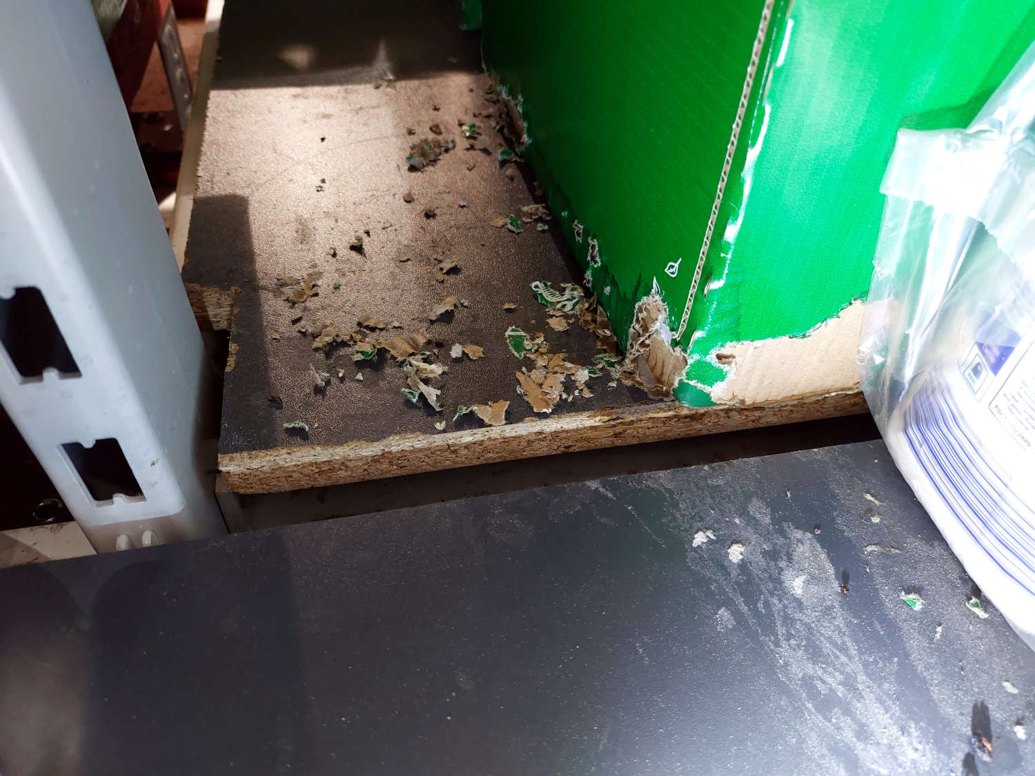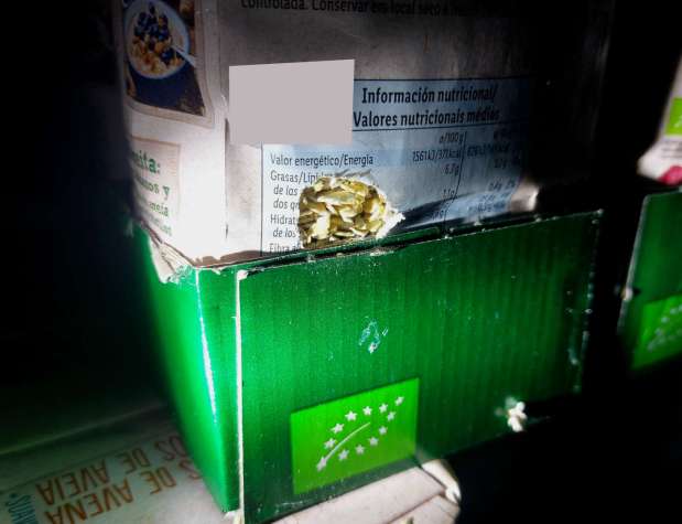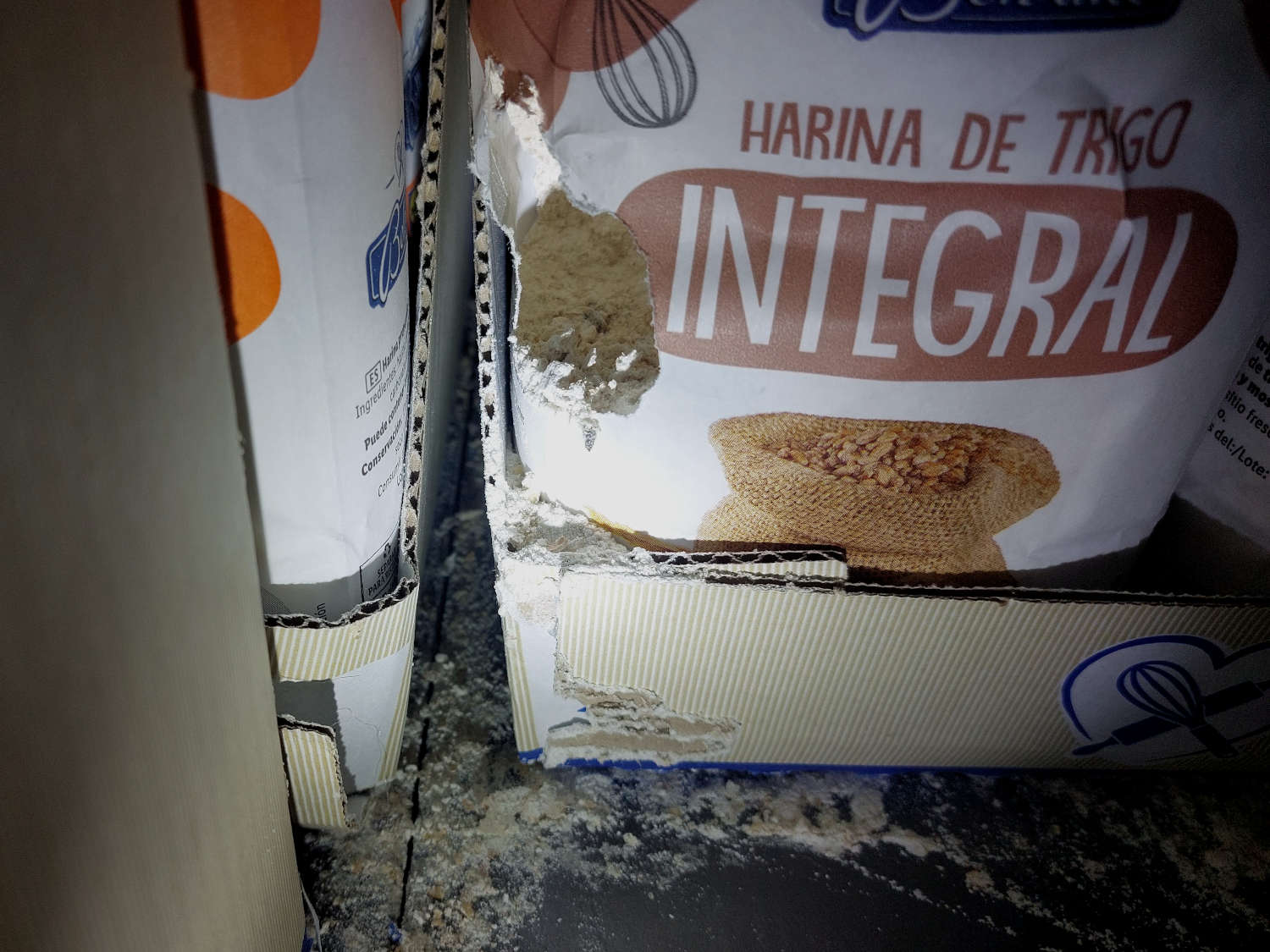 El pasado jueves estuve en un cliente donde la población de ratón doméstico (Mus musculus) se había desmadrado. Se trata de un establecimiento alimentario donde esta especie puede encontrar todo lo necesario para su supervivencia y proliferar casi sin limite. A veces sorprende dónde son capaces de establecerse porque gracias a su pequeño tamaño encuentran fácilmente acomodo en espacios angostos como interior de los herrajes de estanterías. Eso sí, siempre que pueden se encuentran cerca del alimento, cuando no directamente en este. En las imágenes 3 a 24 se puede ver detalle de las evidencias de paso y del deterioro de mercancía diversa. Había mucho papel y cartón roído, lo cual es lógico en esta época del año. El frío obliga a los ratones llenar sus nidos de material para protegerse del frío.