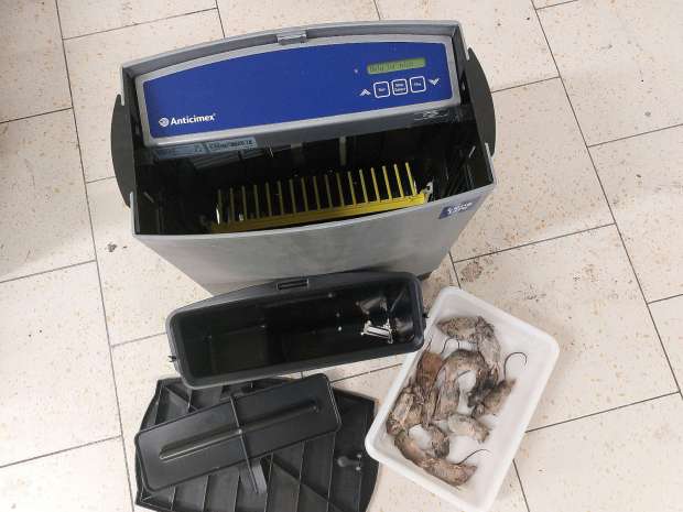 Una de las zonas más afectadas era la zona de basuras donde hay una compactadora de cartón. Es un aparato grande que acumula debajo y a su alrededor suciedad. Allí se instaló en la anterior visita una trampa de multicaptura modelo Smart Box de Anticimex. Este modelo electrocuta los ejemplares que se introducen en la trampa. Los almacena en una contenedor cerrado y manda un aviso. Así que antes de acudir, supimos que había 14 capturas (figuras 1 y 2). Al retirar los ratones del dispositivo, observé que todos eran adultos. Así que pensé que podría ser una muestra representativa de la población de ratón doméstico. Me los llevé para tomar las medidas corporales básicas. Las variables son peso, longitud de cabeza-cuerpo y longitud de cola. La longitud no es fácil tomarla, así que decidí que la precisión sería de medio centímetro.