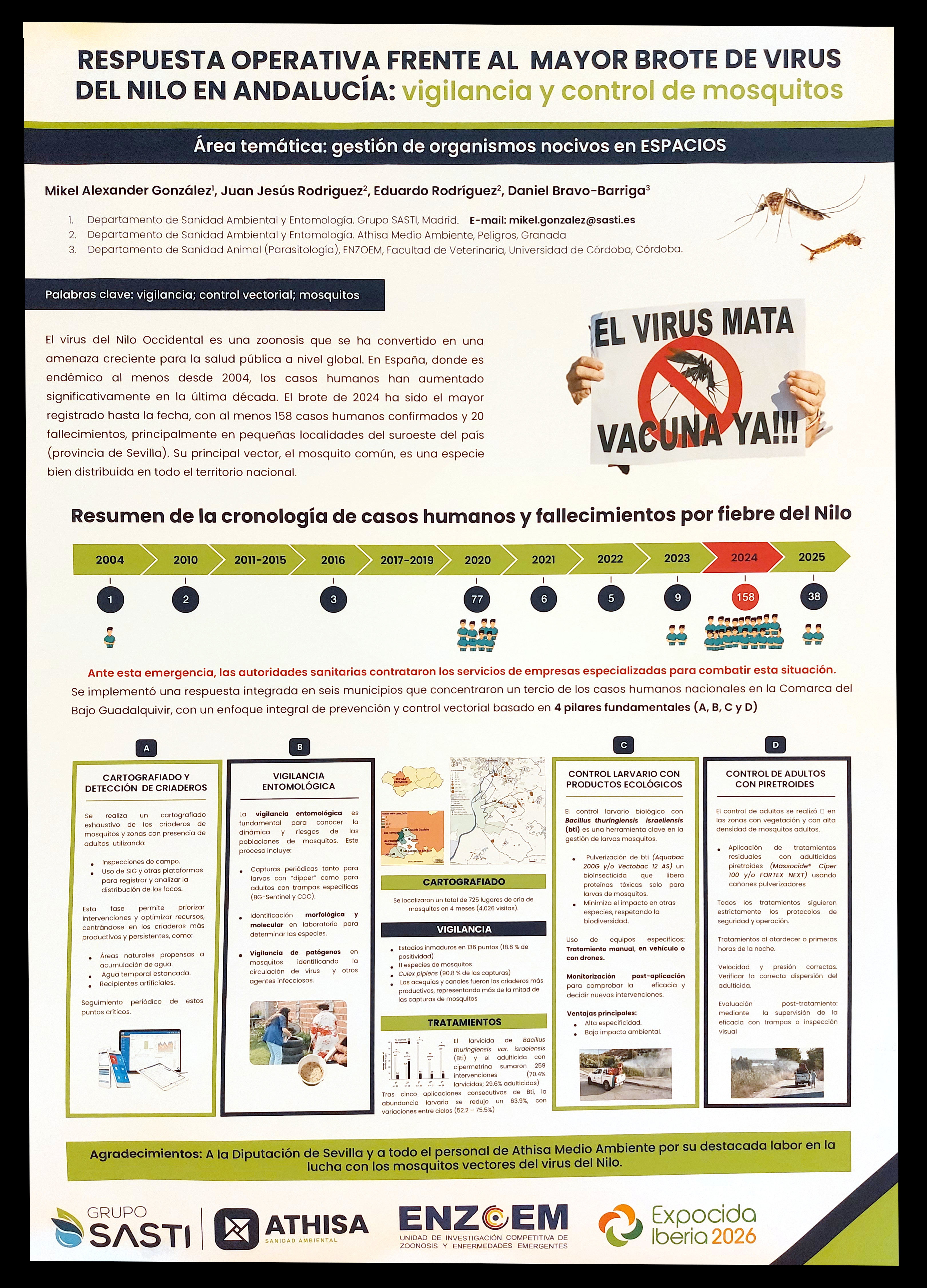 Figura 13. PÓSTER 12 – ‘Respuesta operativa frente al mayor brote de virus del Nilo en Andalucía: vigilancia y control de mosquitos’, por Mikel Alexander GONZÁLEZ, Juan Jesús RODRÍGUEZ, Eduardo RODRÍAGUEZ & Daniel BRAVO-BARRIGA.